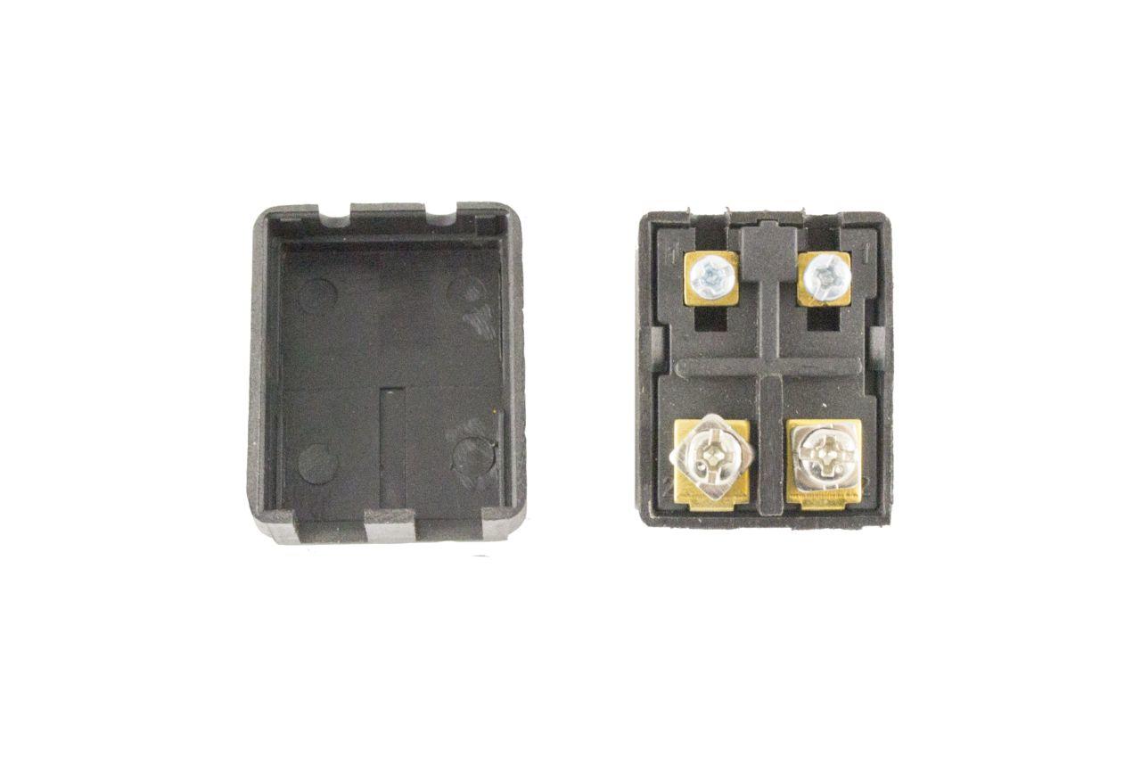 У вільному положенні контакти замкнуті, при натисканні - розмикаються. Має кріплення мережевих дротів гвинтами.