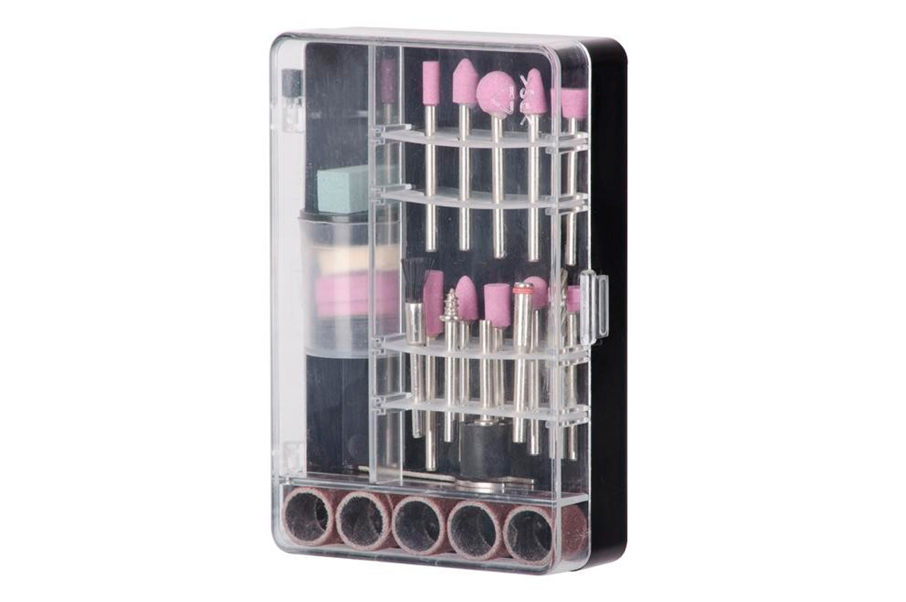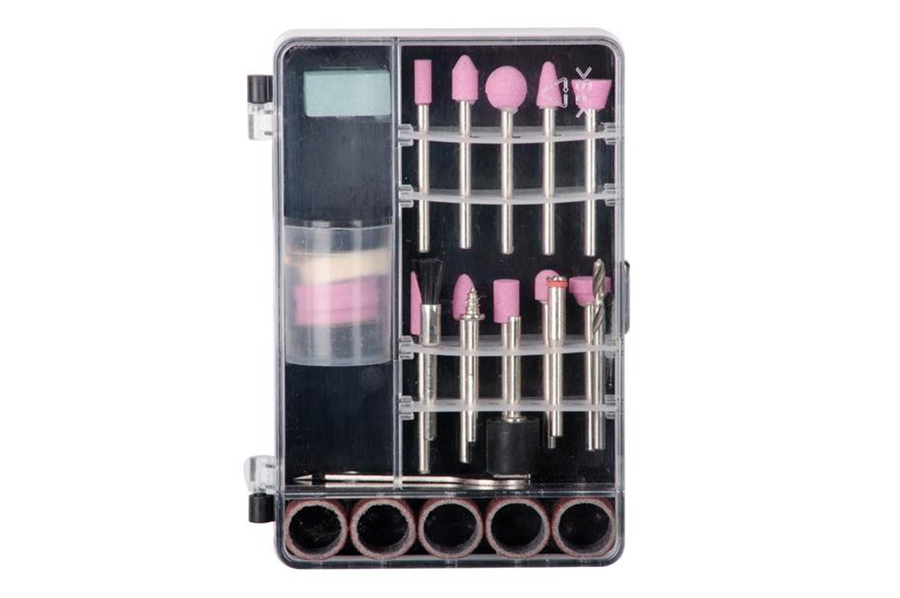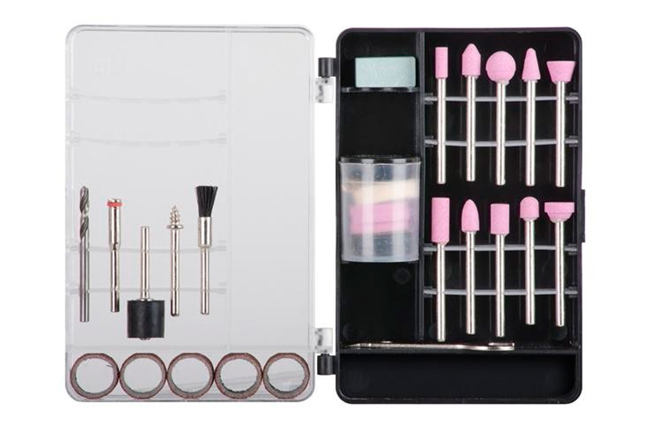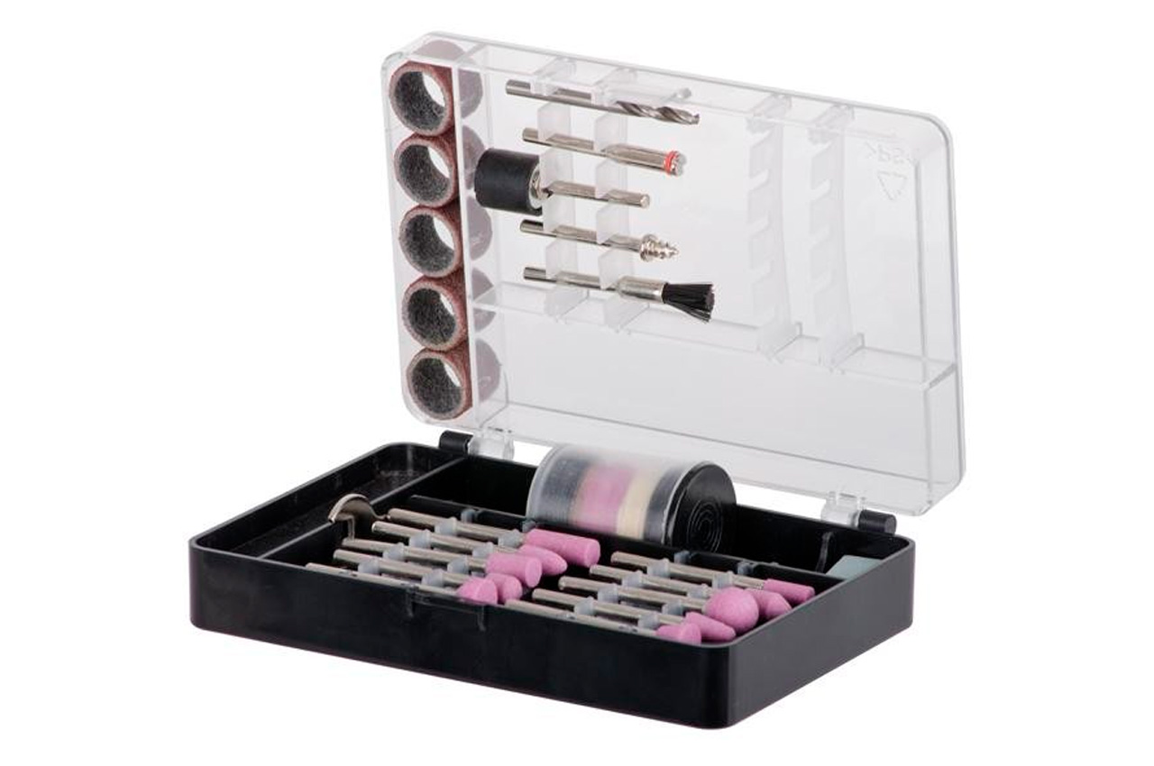 Комплект аксесуарів для гравера містить в собі базовий набір насадок для гравера для виконання різноманітних завдань. Всі насадки оснащені хвостовиком Ø 3,2 мм. Діаметр осі: 3,2 мм; Кількість одиниць в наборі: 42