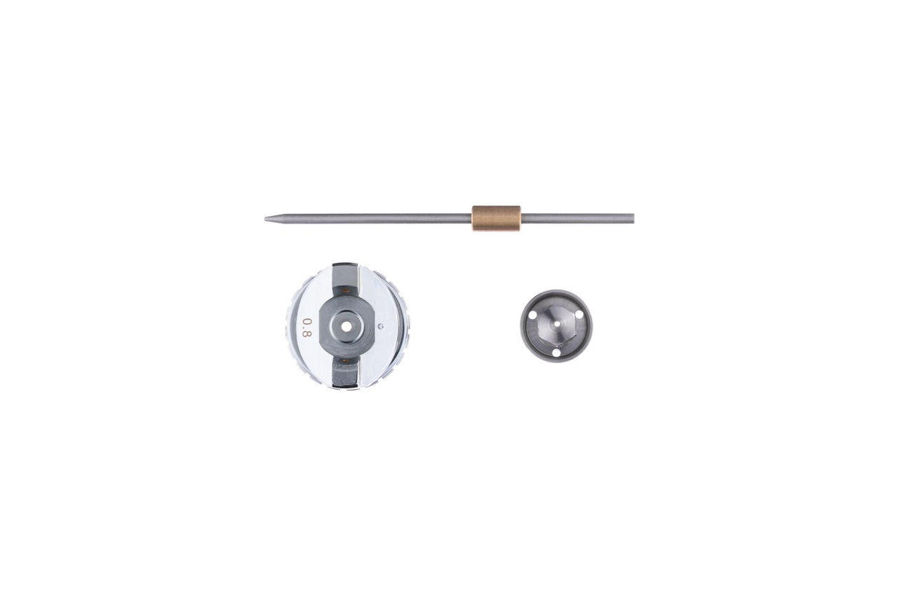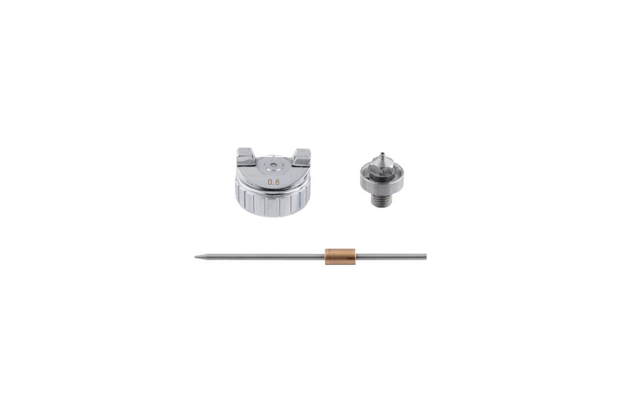 Змінний комплект форсунок для фарбувального пістолета РТ-0129, використовуються для заміни поламаних форсунок фарбопульта або при необхідності зміни стандартного розміру форсунки. Діаметр форсунки: 0.8 мм; Сумісність: PT-0129