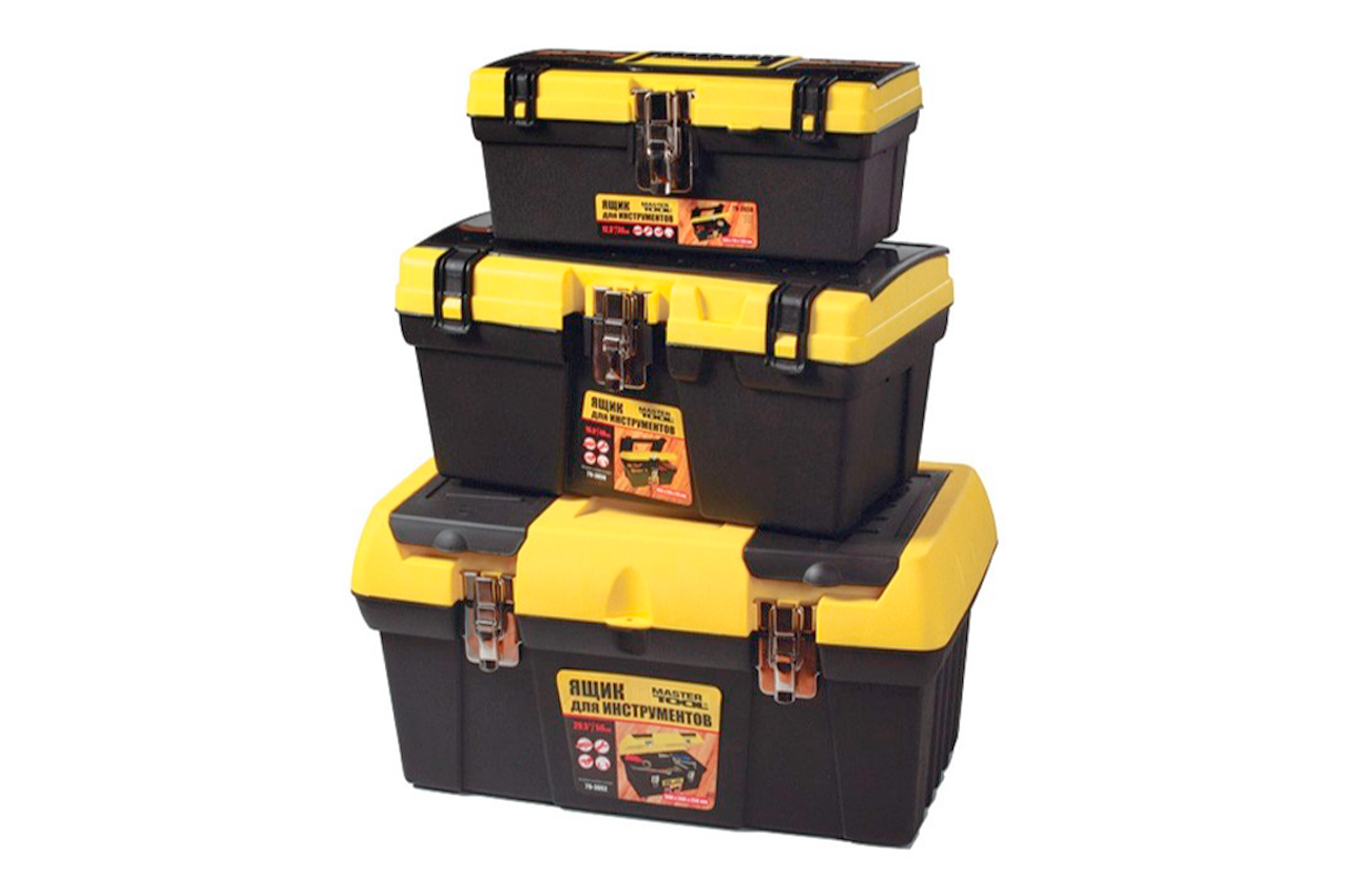 У наборі 3 жетлих ящика: 12.5, 16 і 19 ". Призначений для зберігання і транспортування інструмента. Всі ящики виготовлені з міцного пластику. Мають всередині піддон для інструменту. Ящики надійно закриваються за допомогою пласмассовий засувок. Напівпрозора пластикова кришка забезпечена відділеннями під кріплення і органайзером під невеликий інструмент.