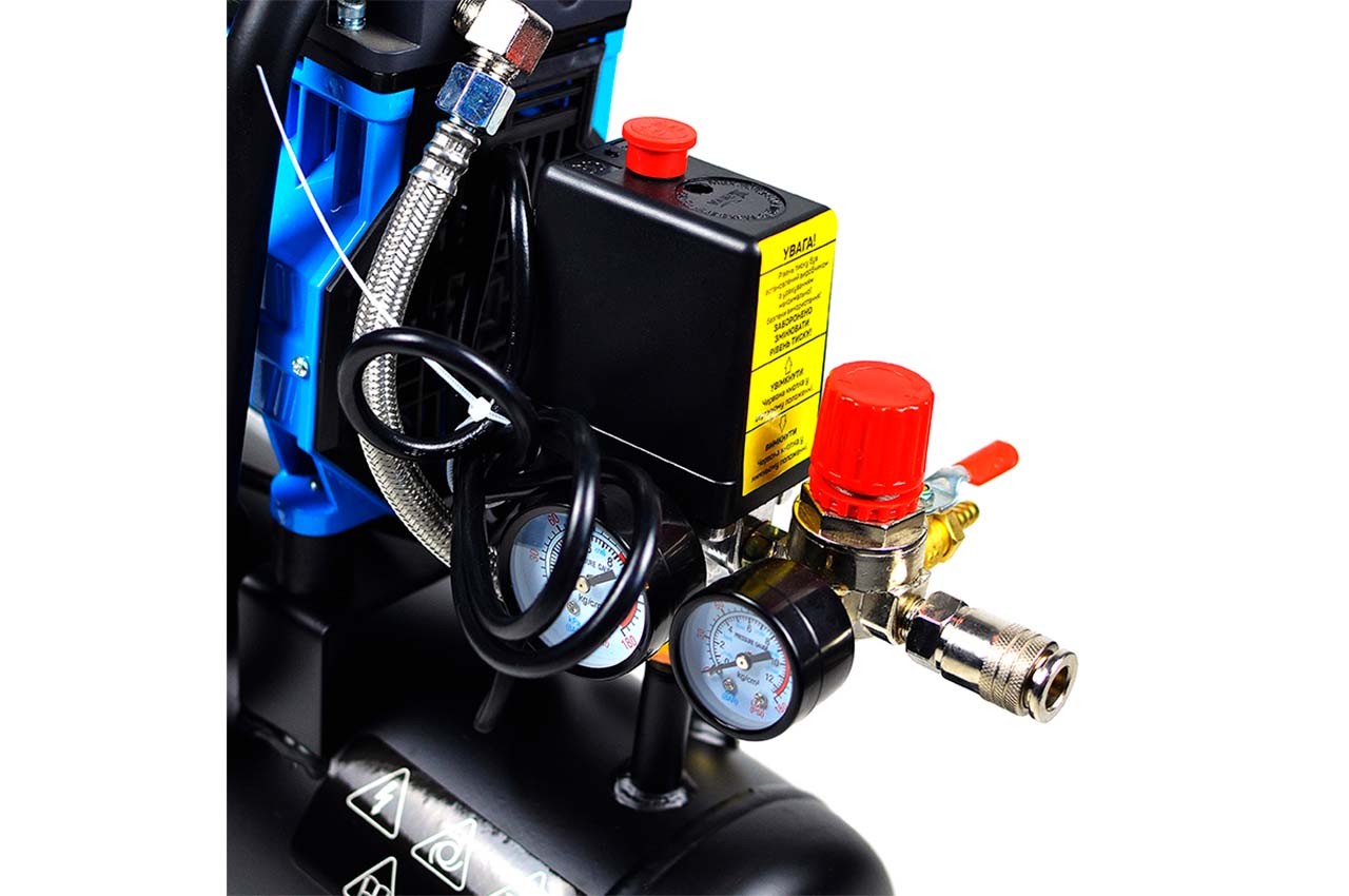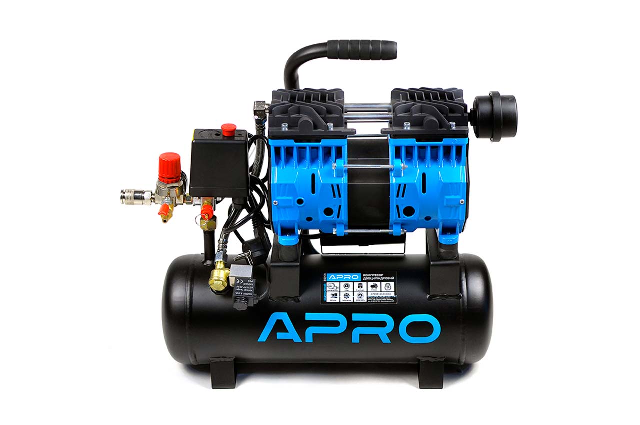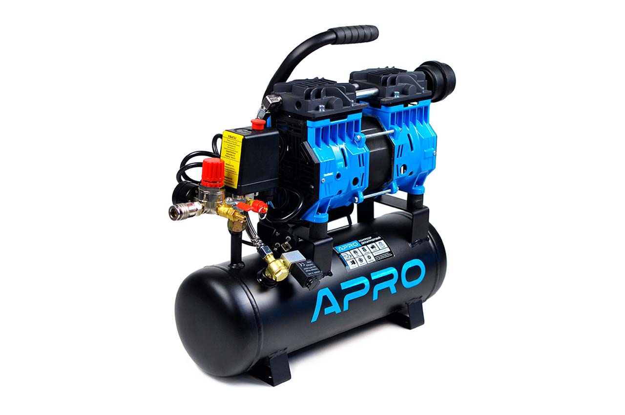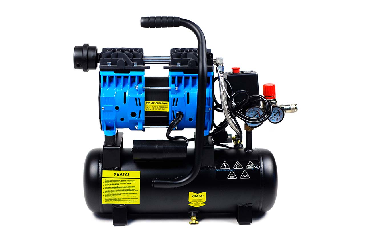 Компресор має невеликий ресивер на 9 л., що найкраще підійде для роботи з аерографами та пневмоінструментами малої потужності. Дана модель компресора працює без масла, тому не вимагає технічного обслуговування контролю та доливу масла. Відрізняється чистим повітрям на виході, що не містить домішок. Компресор відмінно підійде для використання в аерографії, медицині, харчовій промисловості та інших сферах, де потрібне чисте повітря на виході. Компресор має два виходи стисненого повітря через швидкознімний і звичайний штуцер. Це дає можливість працювати двома інструментами одночасно і без особливих проблем використовувати компресор майже з усіма пневмоінструментами. Дана модель відмінно відводить тепло завдяки особливій формі двигуна та способу його розміщення на корпусі компресора. Функція автоматичного включення не дає тиску в компресорі опуститись нижче 6 бар. Це дозволяє працювати у безперервному режимі. Крім цього, безмасляний компресор більш тихий під час роботи в порівнянні з масляними аналогами.