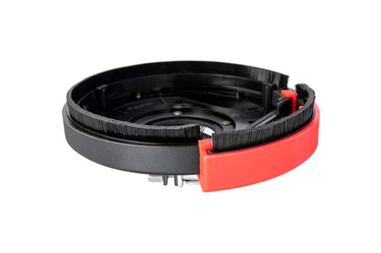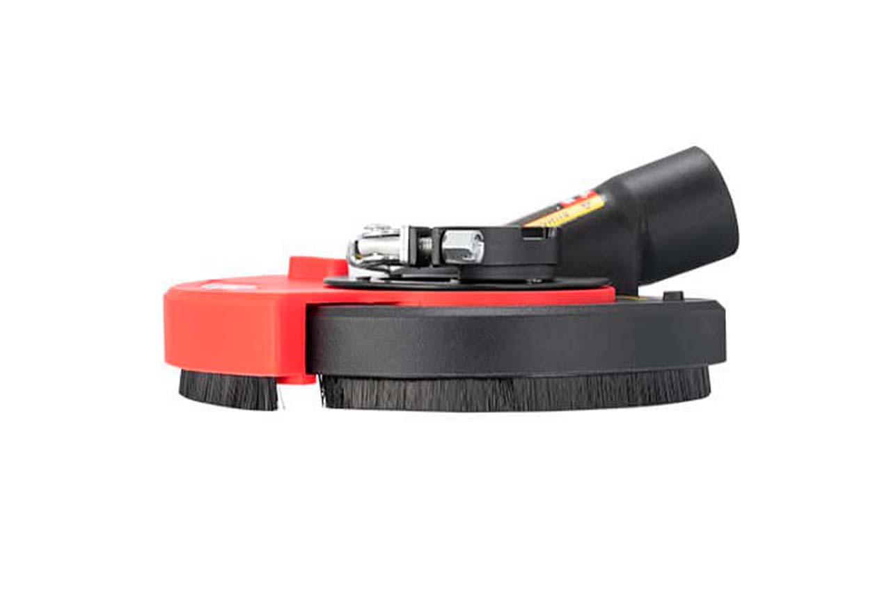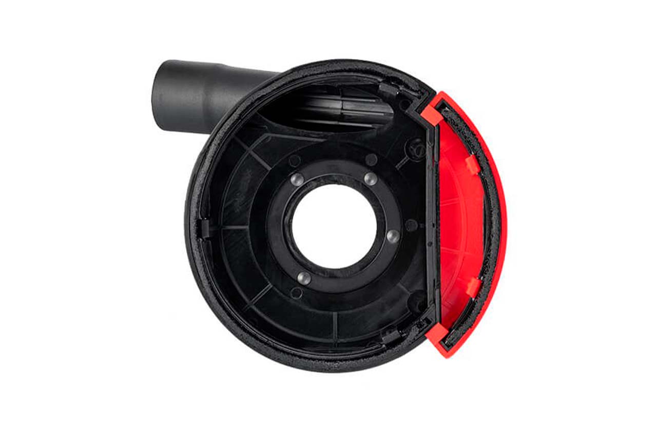 Кожух з пиловідводом ST-0004 призначений для ефективного відводу пилу з робочої зони при обробці поверхонь торцевими чи чашковими фрезами. Є можливість підключення до пилососу чи пилозбірного мішка. Кожух виготовлений з антистатичного ABS-пластика, який значно знижує кількість налипаючого на нього пилу. Підпружинений нейлоновий ворс у місці контакту з поверхнею точно повторює всі нерівності, мінімізуючи викиди пилу назовні. По периметру кожуха розташовані отвори. Під час роботи повітря, що затягується через них, створює турбулентний потік, який максимально швидко виводить пил у патрубок пиловідводу, а також додатково охолоджує фрезу, подовжуючи строк її служби. Кожух підходить для встановлення на кутові шліфмашини з дисками 125 мм, т. як в комплекті поставляється набір кілець-перехідників під різні посадкові діаметри. Також у комплекті є ключ для притискної гайки і опірний фланець.