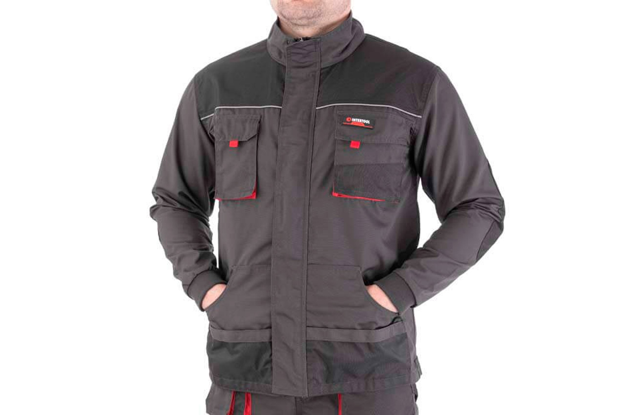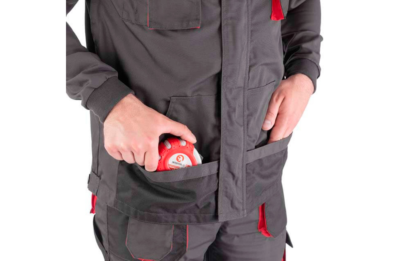 Куртка темно-сірого кольору з чорними вставками виготовлена з щільної тканини (260 г / м²), із співвідношенням поліестеру 80% і бавовни 20%, володіє підвищеними показниками міцності і зносостійкості. Вільний крій моделі з прямим силуетом гарантує свободу руху, тим самим забезпечуючи високий рівень комфорту в роботі. Продуманий крій з 7 кишенями для зберігання ручного інструменту Блискавка з вітрозахисним клапаном Кант з світловідбиваючої тканини на грудях і спині для видимості в темний час доби Накладки з щільної тканини на ліктях для захисту від стирання Посилені шви, виконані потрійний рядком для підвищеної міцності В області пахв на блискавки розміщені перфоровані вставки для вентиляції М'який трикотажний манжет на рукавах Ширина по низу куртки може регулюватися в двох положеннях за допомогою гудзиків