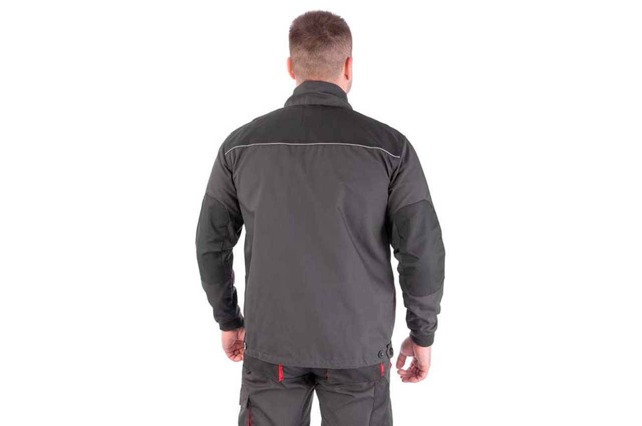 Куртка темно-сірого кольору з чорними вставками виготовлена з щільної тканини (260 г / м²), із співвідношенням поліестеру 80% і бавовни 20%, володіє підвищеними показниками міцності і зносостійкості. Вільний крій моделі з прямим силуетом гарантує свободу руху, тим самим забезпечуючи високий рівень комфорту в роботі. Продуманий крій з 7 кишенями для зберігання ручного інструменту Блискавка з вітрозахисним клапаном Кант з світловідбиваючої тканини на грудях і спині для видимості в темний час доби Накладки з щільної тканини на ліктях для захисту від стирання Посилені шви, виконані потрійний рядком для підвищеної міцності В області пахв на блискавки розміщені перфоровані вставки для вентиляції М'який трикотажний манжет на рукавах Ширина по низу куртки може регулюватися в двох положеннях за допомогою гудзиків