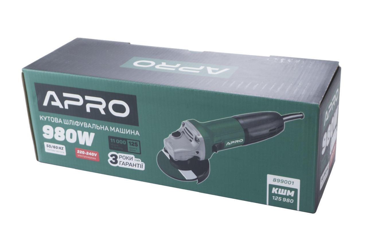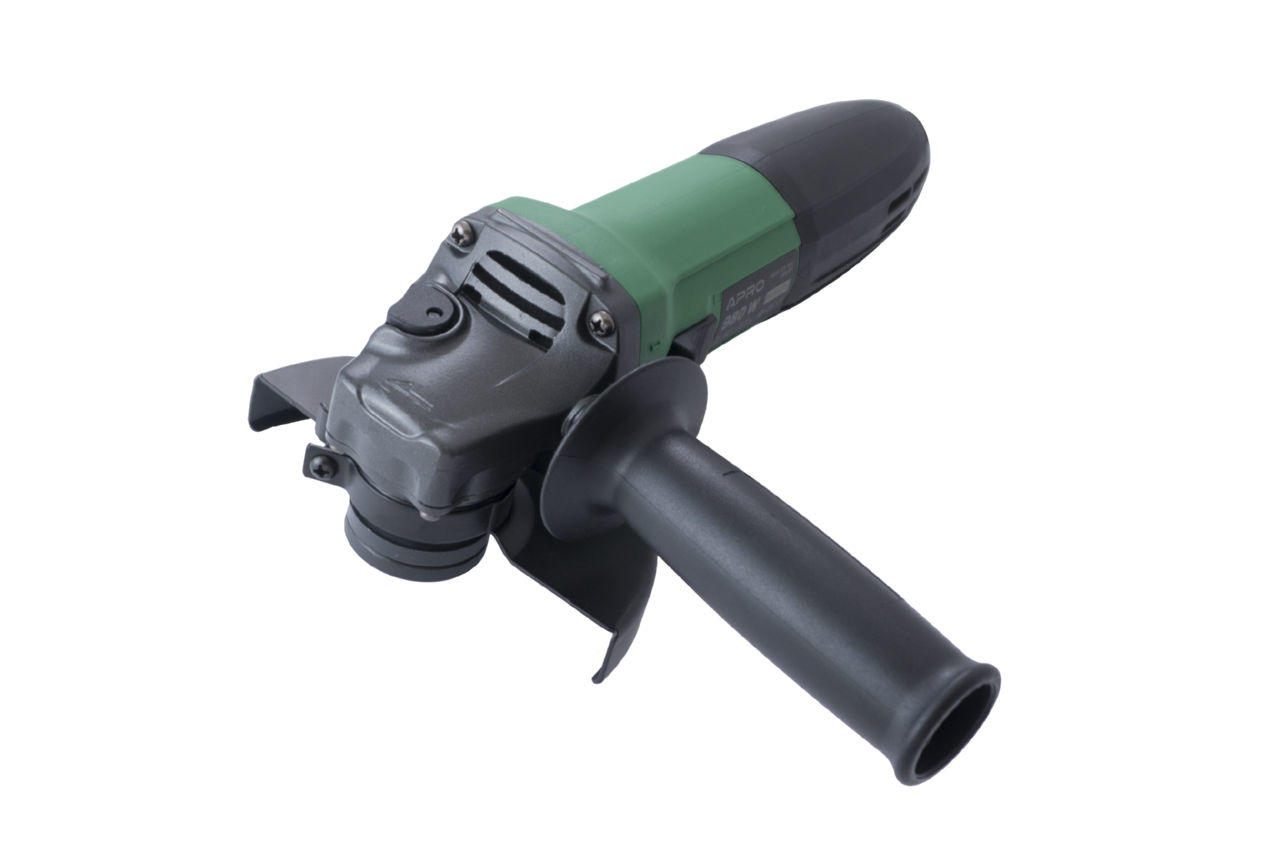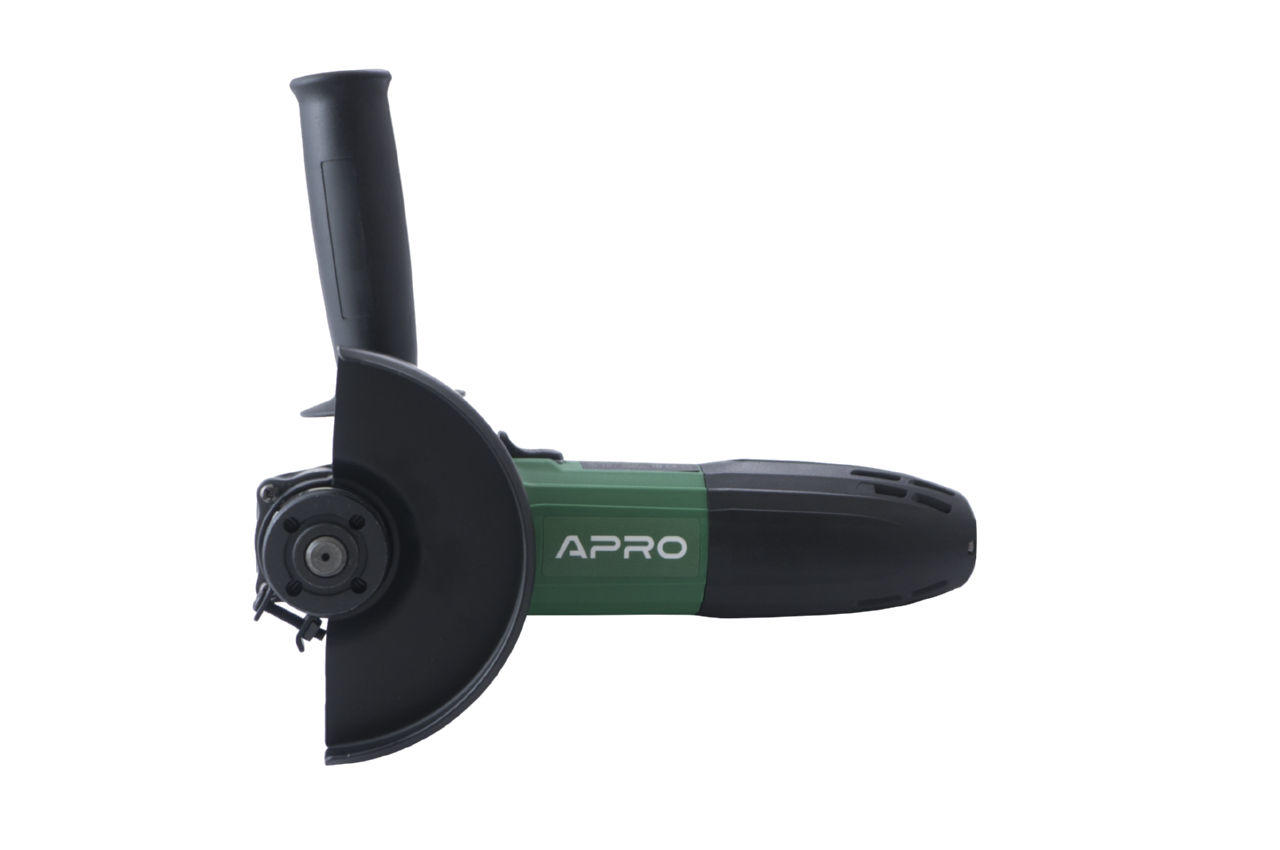 Кутова шліфувальна машина Apro - КШМ 125. Болгарка оснащена можливістю регулювати оберти. При потужності 980 Вт і оборотах 11000 різатиме або шліфуватиме як бетонну стіну, так і дерев'яні конструкції. Завдяки своїм можливостям, здатна працювати з тонкими та крихкими матеріалами. Робити максимально точні, практично ювелірні надрізи. А в поєднанні з маленькою вагою (2,4 кг) і компактними розмірами руки від напруги у майстра не втомляться, навіть якщо він працюватиме у важких вузьких місцях і з витягнутою рукою.