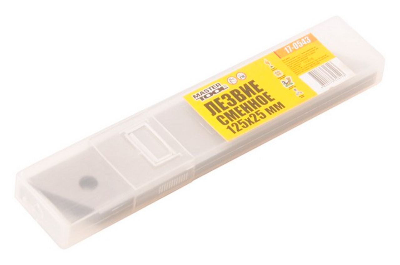 Комплект лез сегментних Mastertool - 10 змінних лез, виготовлених з високовуглецевої сталі. Ширина полотна - 25 мм. Поставляється в пластиковому блістері. Використовуються з прорізними ножами для різання паперу, картону та інших подібних матеріалів при будівельних і оздоблювальних роботах.
