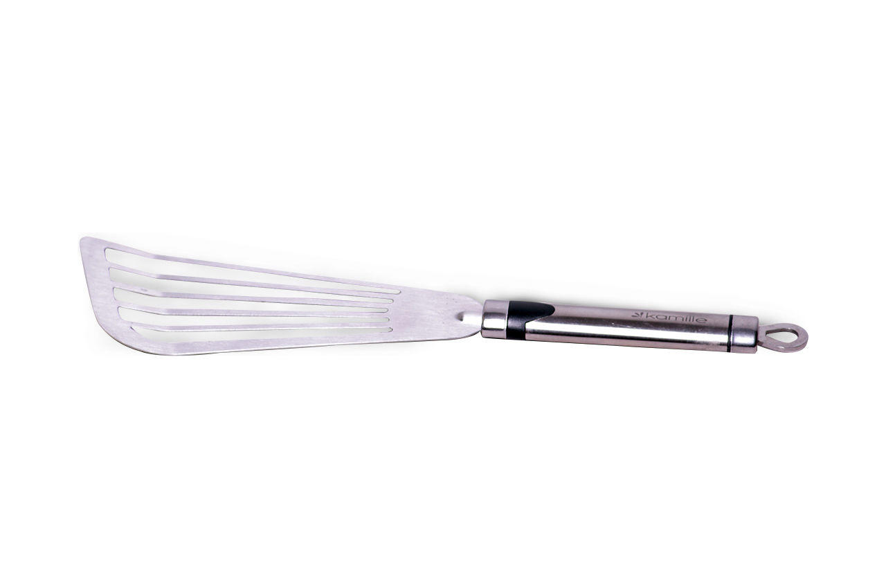 лопатка Kamille для приготування їжі на сковороді. Робоча частина виготовлена з нержавіючої сталі, яка не впливає на смак та запах їжі, легко миється. Оснащена зручною ергономічною ручкою. Відмінна лопатка для домашнього чи професійного використання