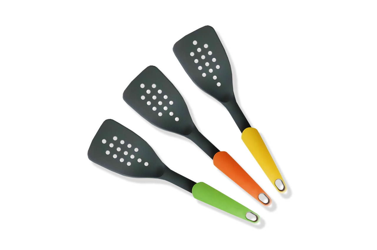 Пластикова лопатка з кольоровою силіконовою ручкою Maestro MR 1162 має витягнуту форму, призначена для роботи з посудом з ніжним антипригарним покриттям.