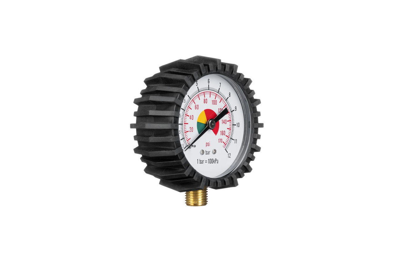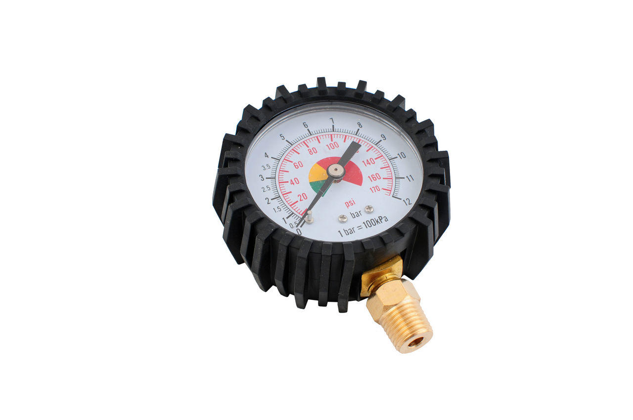 Манометр PT-0502 підходить до будь-яких пістолетів для накачування шин і інших пристроїв. Має зовнішню різьбу 1/4 "з нижнім розташуванням. Простий у використанні, цей стрілочний манометр гарантує високоточне вимірювання тиску. Може бути використаний для відображення тиску на будь-яких пристроях і механізмах, що працюють зі стисненим повітрям від 0 до 12 бар. Міцний і, в той же час, еластичний пластиковий корпус з гумовим покриттям захищає манометр від механічних пошкоджень. Особливості: Подвійна шкала PSI, bar Тиск 12 бар Різьба 1/4 "Різьблення: 1/4"