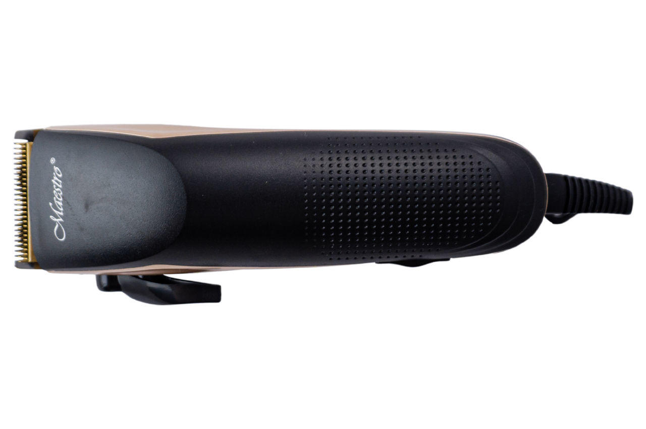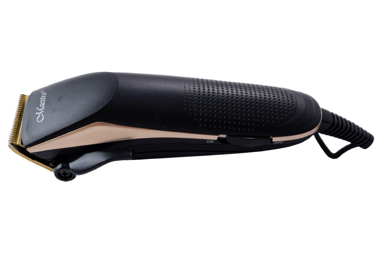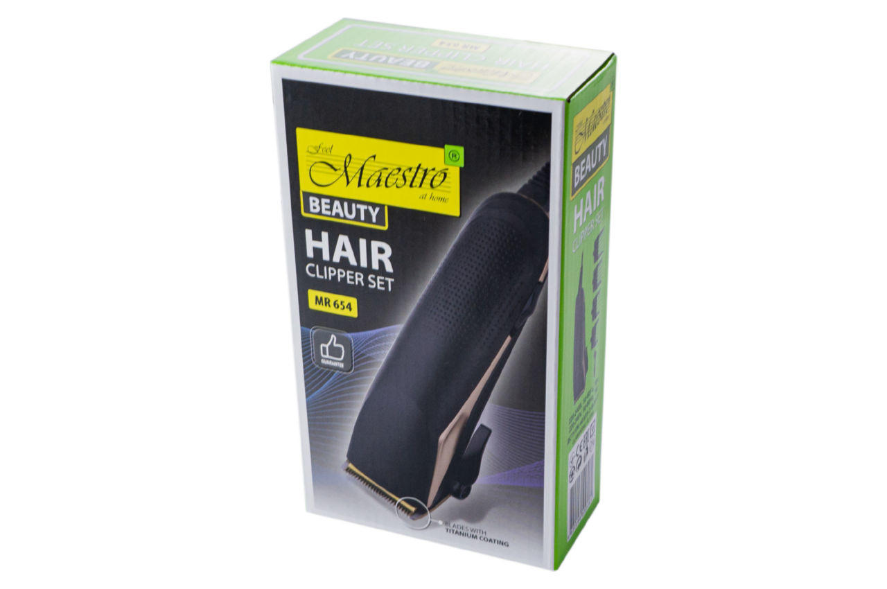 Машинка для стрижки волосся Maestro (MR-654Ti) - Потужність: 220-240В, ~50Гц, 7 Вт - Машинка для стрижки волосся з набором аксесуарів - Леза з титановим покриттям - Чотири змінні насадки (3, 6, 9, 12 мм) - Щітка для чищення машинки - Надтиха робота