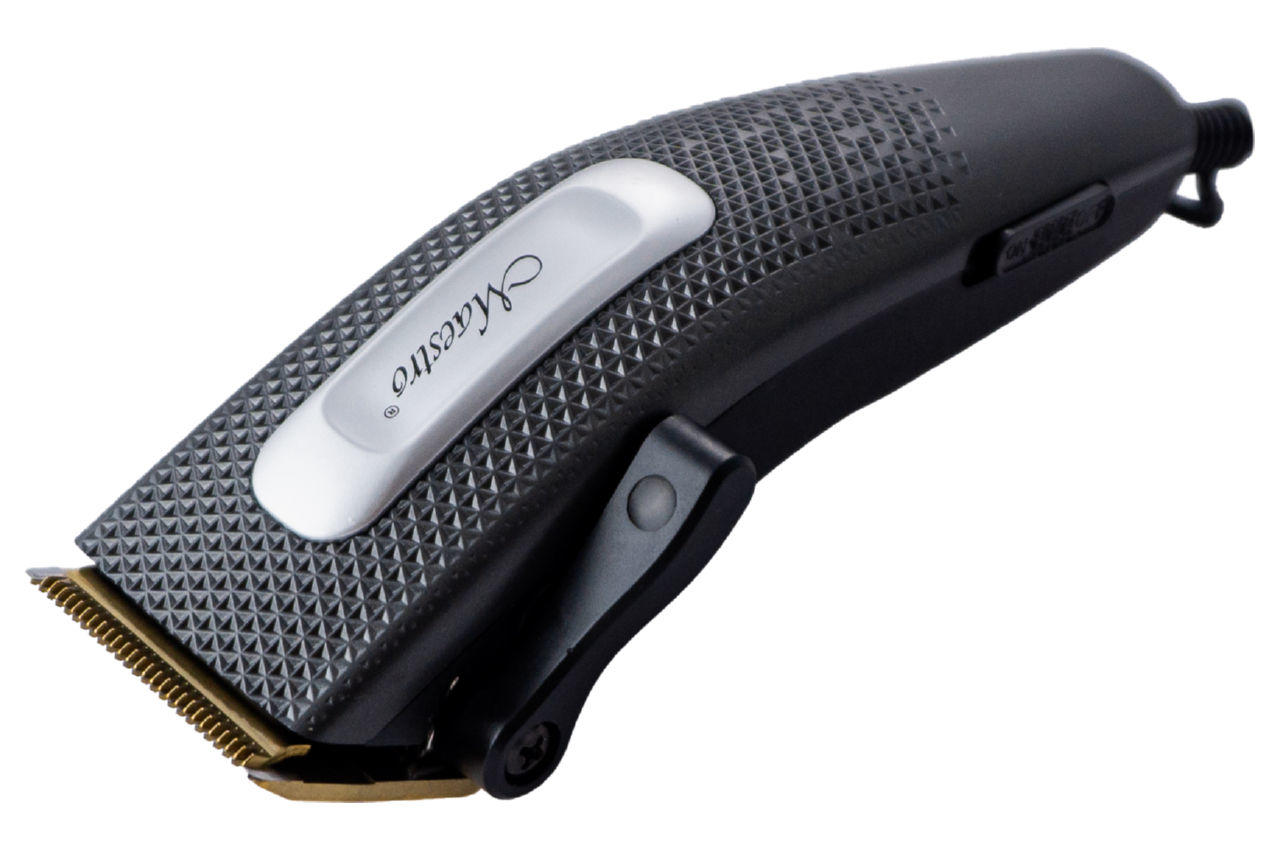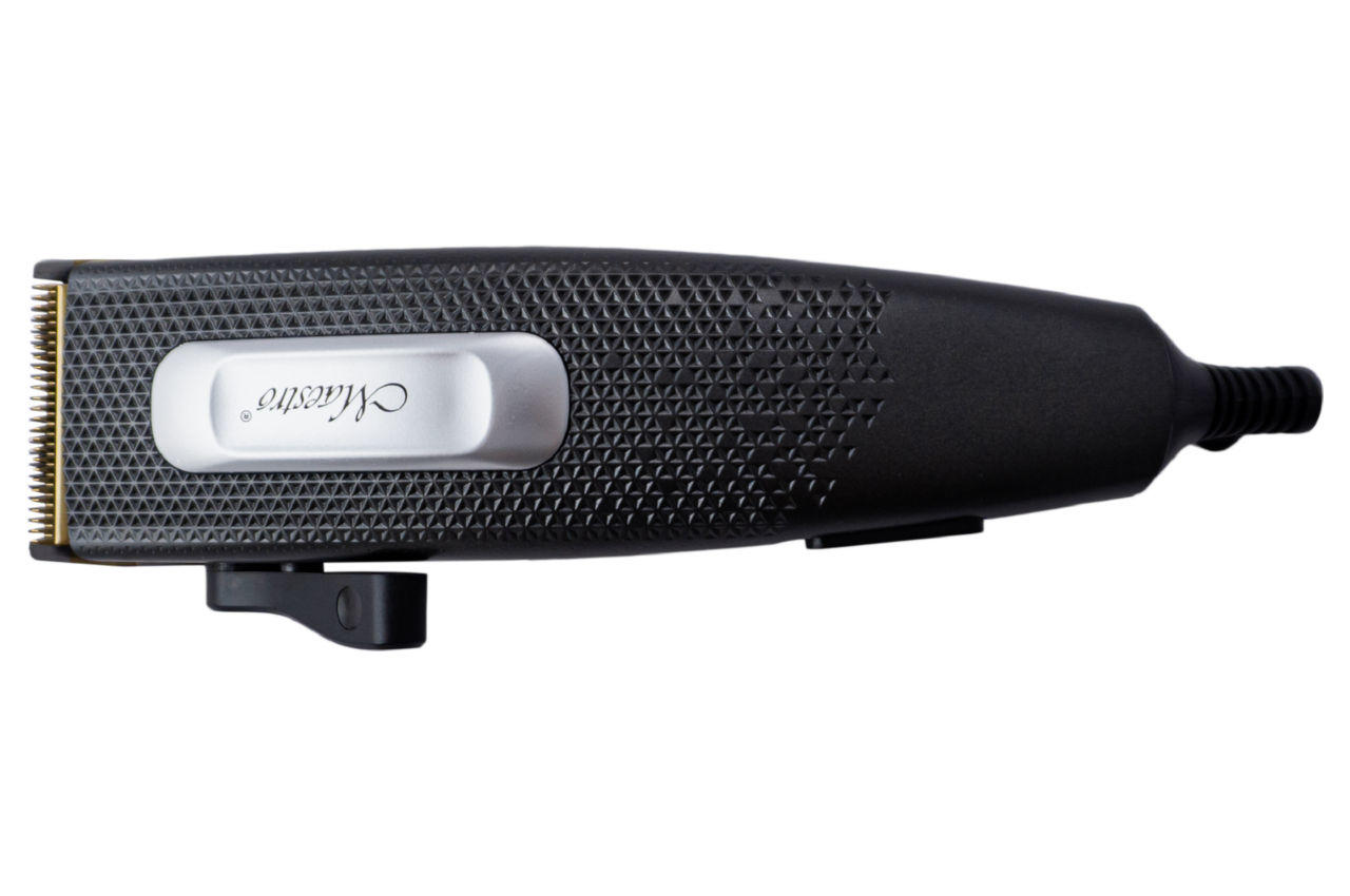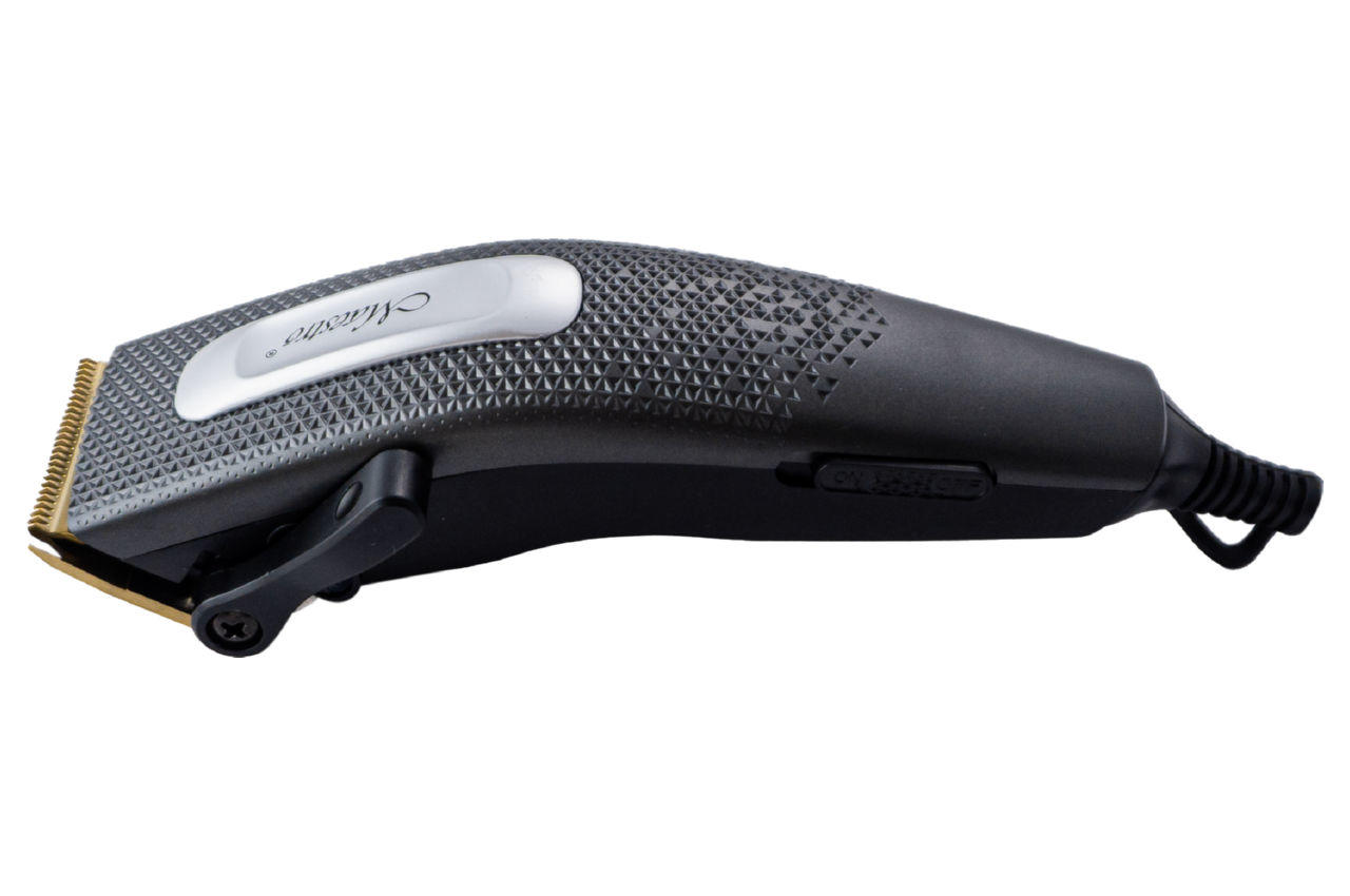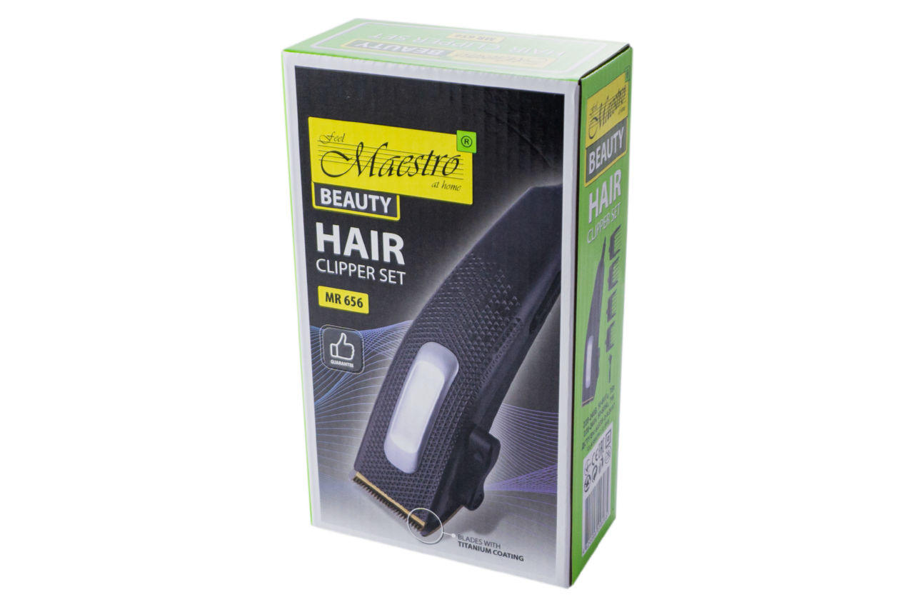 Машинка для стрижки волосся Maestro MR 656 Ti потужністю 7 Вт із ножами з титановим покриттям. У комплекті поставляються чотири змінні гребені (3, 6, 9, 12), олія для змащування ножів, щіточка для чищення, ножиці та гребінець.