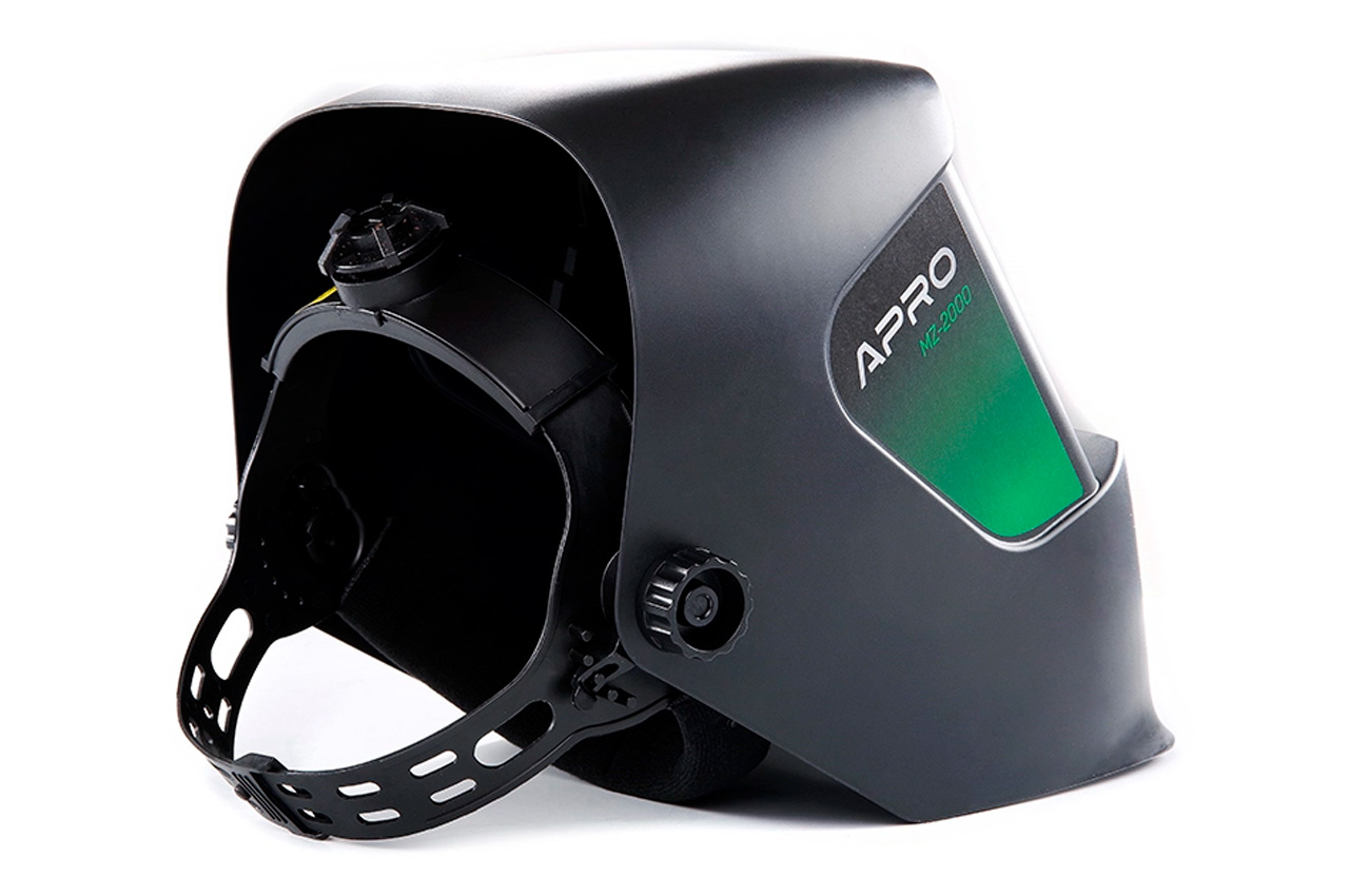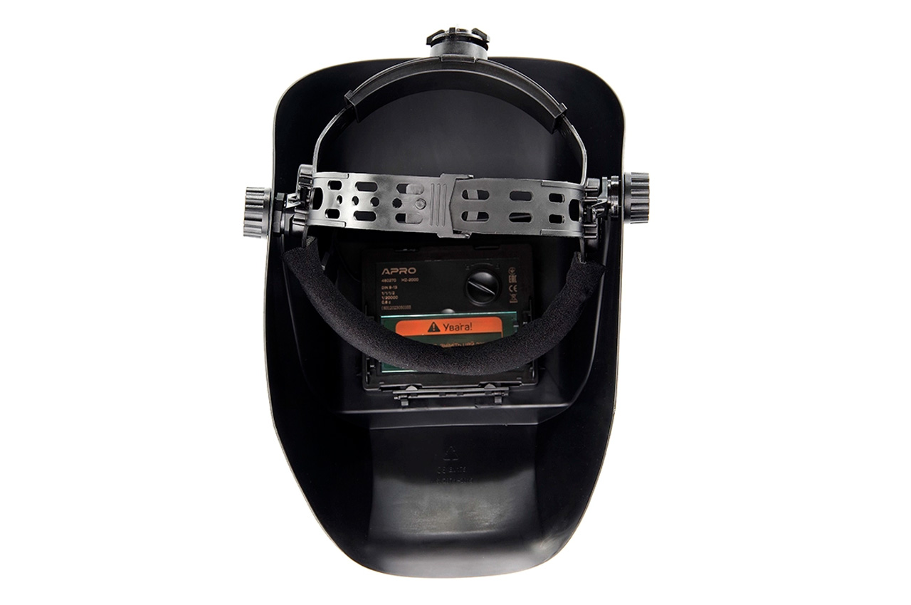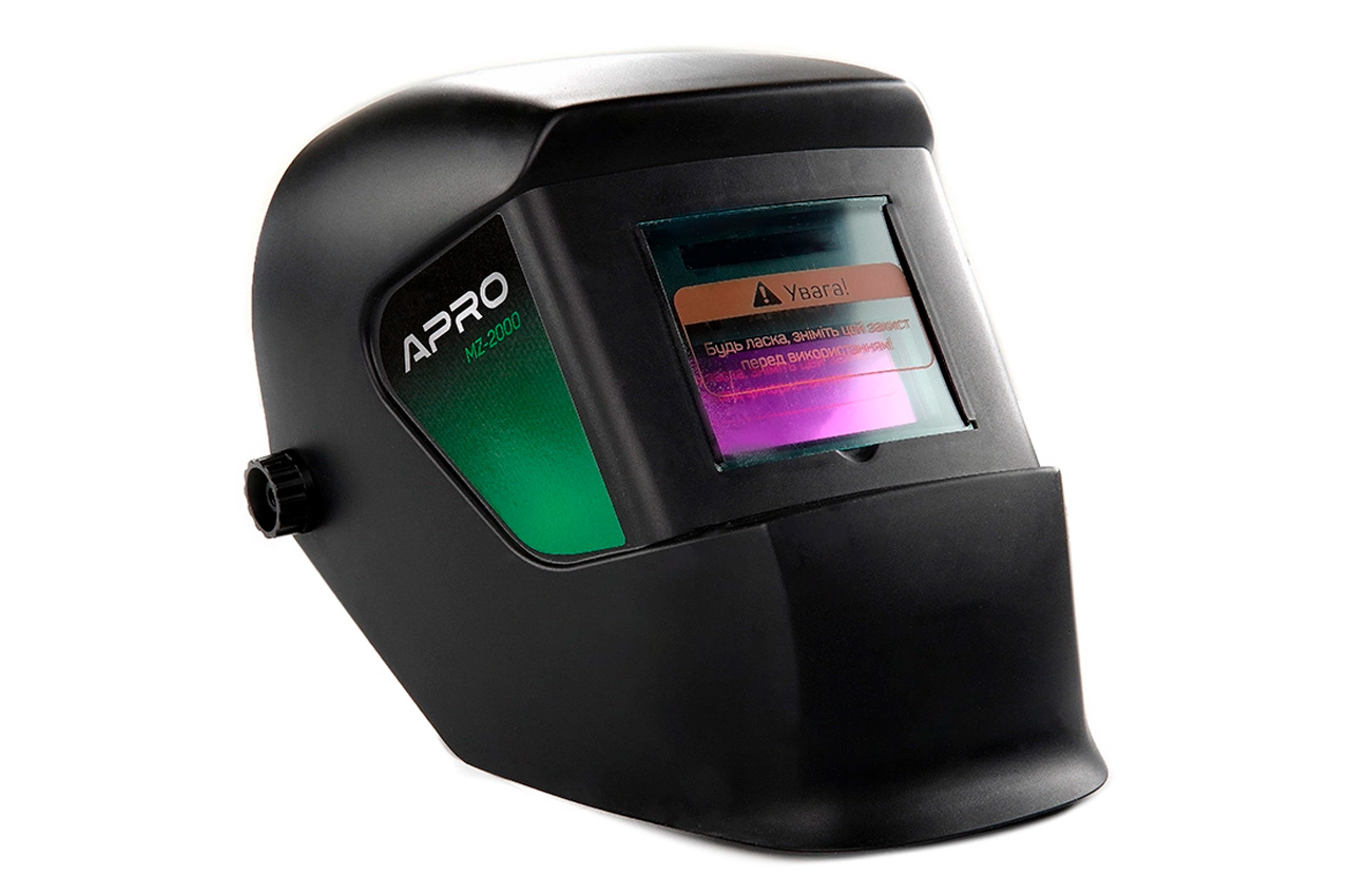 Маска зварника має регулювання ступеня затемнення від 9 до 13 DIN. Живлення здійснюється від сонячної батареї та незмінного літієвого акумулятора. Також маска-хамелеон виконана з ударостійкого пластику, а світлофільтр захищає від механічних пошкоджень полікарбонатне скло. Повністю регульоване оголов'я підвищує комфортність роботи та знижує втому. Маска зварювальника Apro оснащена автоматичним світлофільтром з високою швидкістю спрацьовування — 1/20000 сек.