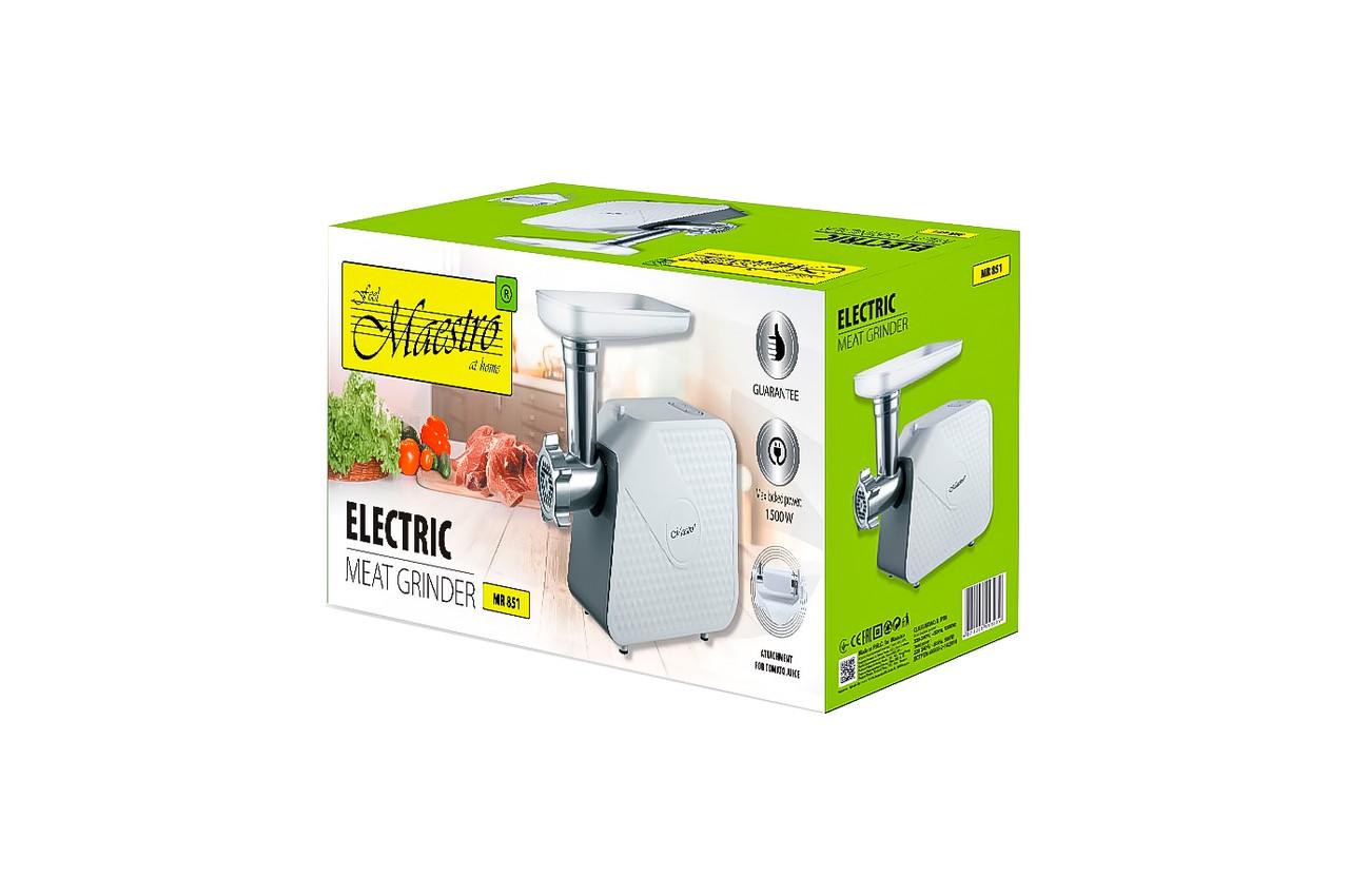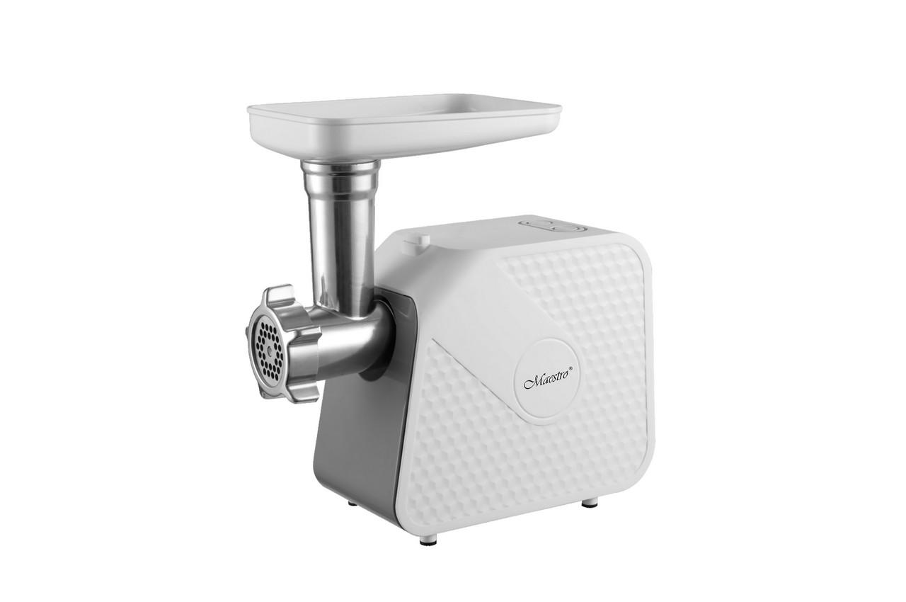 Електрична м'ясорубка Maestro MR 851 потужністю 1500 Вт призначена для перемелювання м'яса, риби, птиці. овочів та інших продуктів. У комплекті постачаються насадки для приготування ковбас, томатного соку, насадка Kebbe, 2 диски для подрібнення з отворами різних діаметрів. Корпус білого кольору оснащений прогумованими ніжками, що запобігають ковзанню м'ясорубки по столу.