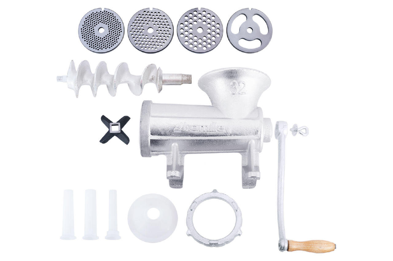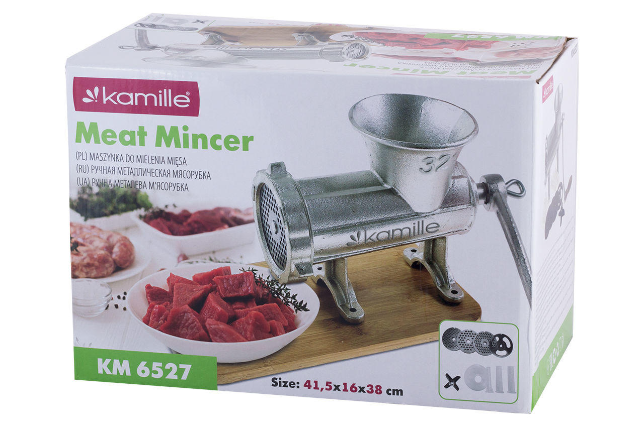 Мясорубка ручна Kamille - це механічне пристосування для приготування фаршу і домашніх ковбасок. М'ясорубка повністю виготовлена з чавуну, а значить, прослужить Вам не один рік. Завдяки розбірної конструкції м'ясорубку легко мити і зручно зберігати. Для більш зручного використання м'ясорубка кріпиться до столу і, таким чином, не ковзає і не їздить по столу.
