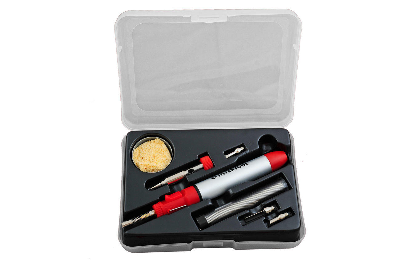 Мікрогорелка з набором аксесуарів включає в свою комплектацію пластикову валізку, 4 насадки для пайки та різання, губку для зачистки жала, олов'яний припій. Ціна даного пальника більш ніж доступна, враховуючи багату комплектацію для виконання багатьох робіт по спайці деталей, нагрівання і різанні. Грілка "олівцем" типу має додаткову металеву ніжку-підставку. Її призначення - це установка пальника в підвішеному стані при максимально розігрітому жалі. Об'єм резервуару: 12 мл; Тип палива: зріджений газ бутан; Регулювання полум'я: так; Температура: 1300 ° С; Матеріал корпусу: алюміній; Займання: від відкритого вогню; Комплектація: пластиковий кейс; <br> 4 насадки; <br> олов'яний припій; <br> губка для чищення