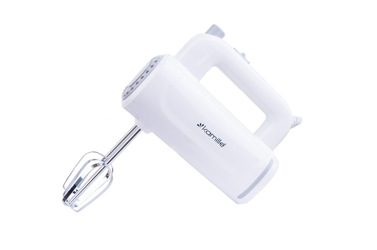 Міксер ручний Kamille, 150W відповідає стандартам якості, які гарантують надійність і зручність у використанні. Міксер має контороль швидкості від 0 до 5, які розташовані для зручного перемикання на ручці. Два віночки для збивання крему та яєць. Дві насадки для замішування густого тіста.