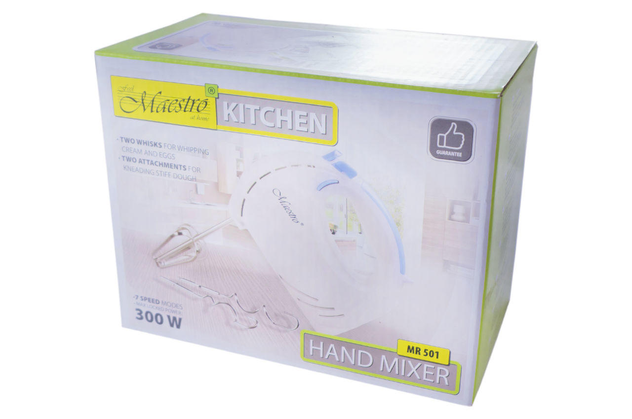 Цей ручний кухонний міксер Maestro MR-501 стане незамінним помічником на вашій кухні. Він оснащений двома віночками та потужністю 300 Вт, що дозволяє легко та швидко збивати яйця, сметану, крем та інші інгредієнти. Крім того, його яскравий зелений колір надає йому стильного та модного вигляду. Цей міксер легкий і зручний у використанні, що робить його ідеальним вибором для домашньої кухні. Особливості: 7 швидкісних режимів Дві віночки для збивання крему та яєць Дві насадки для замісу густого тіста Кнопка звільнення насадок Сучасний, ергономічний дизайн