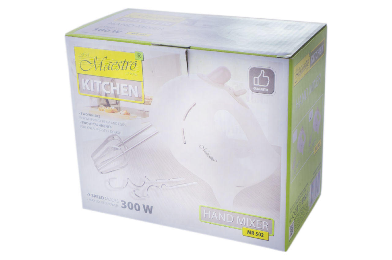 Цей ручний кухонний міксер Maestro MR-501 стане незамінним помічником на вашій кухні. Він оснащений двома віночками та потужністю 300 Вт, що дозволяє легко та швидко збивати яйця, сметану, крем та інші інгредієнти. Крім того, його яскравий зелений колір надає йому стильного та модного вигляду. Цей міксер легкий і зручний у використанні, що робить його ідеальним вибором для домашньої кухні. Особливості: 7 швидкісних режимів Дві віночки для збивання крему та яєць Дві насадки для замісу густого тіста Кнопка звільнення насадок Сучасний, ергономічний дизайн