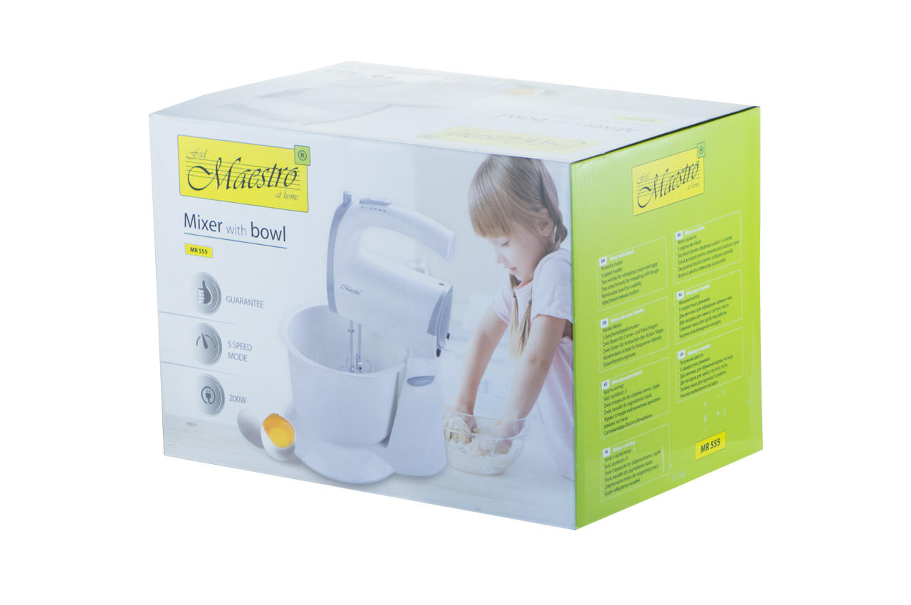 Міксер Maestro MR555 призначений тільки для обробки рідких і нетвердих продуктів в побутових (домашніх) умовах. Особливостями даного міксера є наявність чаші й підставки. Це забезпечує можливість використання міксера в режимі «вільні руки». Частини вироби не містять шкідливих для здоров'я людини речовин.