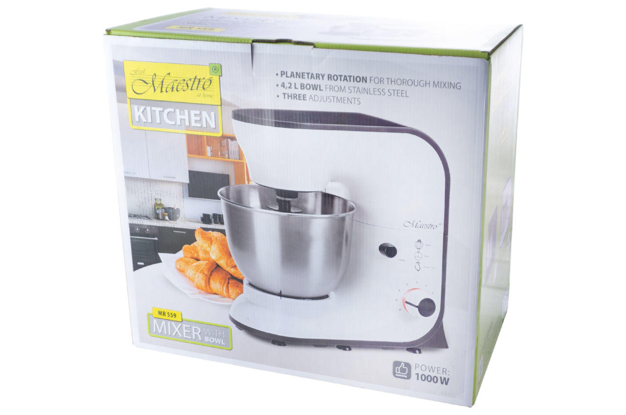 Планетарний міксерMaestro MR-559 відмінно справляється не тільки з замісом різних сортів тесту (білкове, бісквітне, листкове, заварне, дріжджове, пісочне), але і з приготуванням різних кондитерських мас (вершки, креми, муси, суфле, безе). Технологія "планетарного обертання" - це такий спосіб обертання, коли привід здійснює кругові рухи в одну сторону, а віночок (мішалка) в цей час обертається навколо своєї осі в іншу, дозволяє виробляти змішування по всьому об'єму чаші. При цьому на перемішування або збивання витрачається набагато менше часу незалежно від того, що ви готуєте: білкову масу, крем, соуси або тісто будь-якої щільності, а результат завжди буде чудовим.
