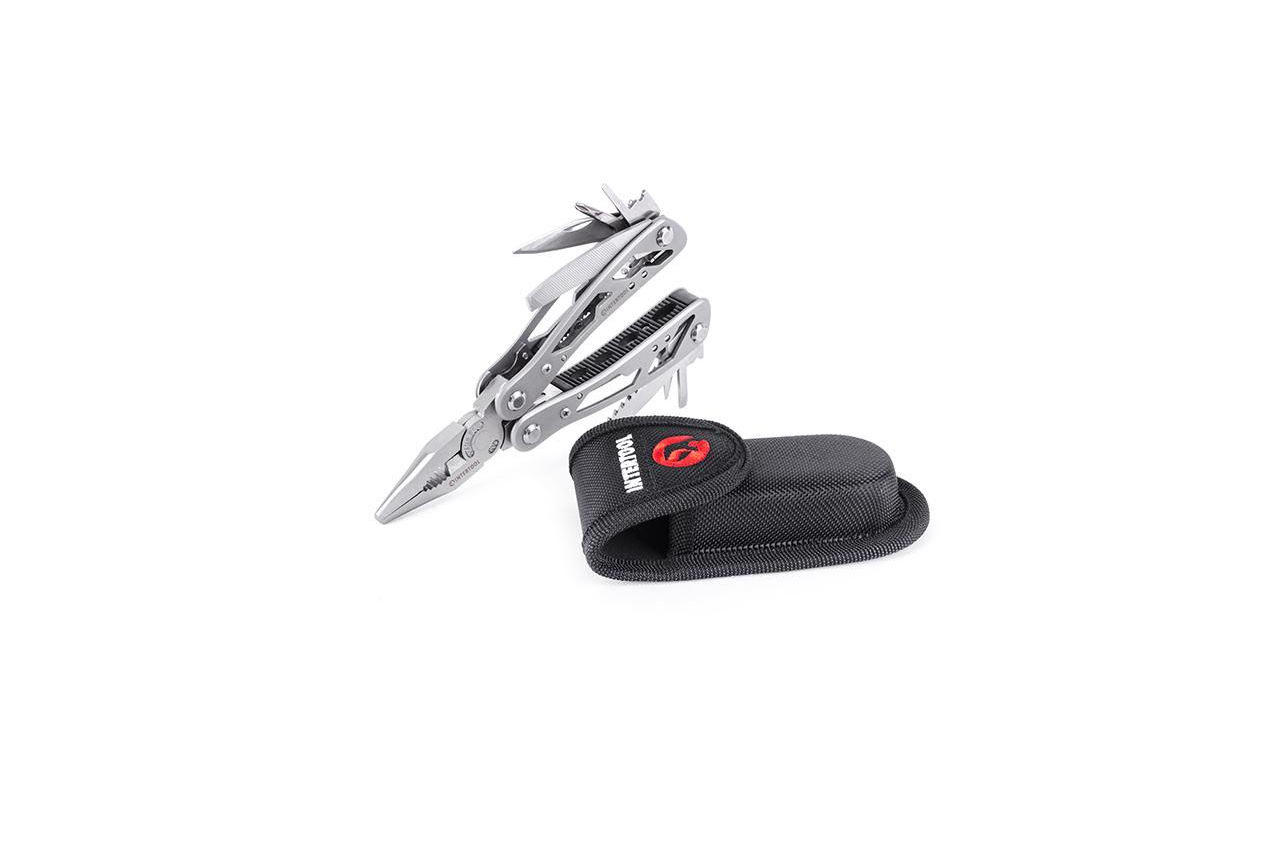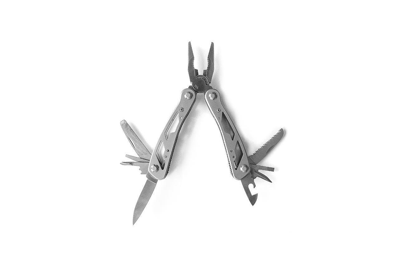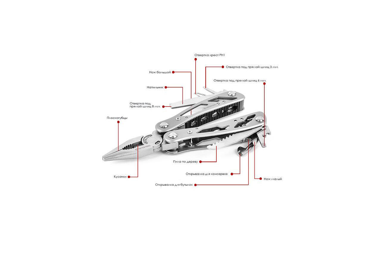 Інструмент виконаний з полірованої нержавіючої сталі. Ергономічний корпус зробить його використання максимально комфортним в будь-яких умовах, а високоміцний тканинної чохол спростить його зберігання і дасть можливість носити його просто на поясі. Мультитул містить: плоскогубці, кусачки, малий ніж, великий ніж, пила по дереву, відкривачка для пляшок, відкривачка для консервів, викрутка під шліц 3 мм, викрутка під шліц 6 мм, викрутка під шліц 8 мм, викрутка хрестова PH1 і напилок. Кількість функцій: 12; Довжина в складеному вигляді: 105 мм; Матеріал клинка: нержавіюча сталь 2Cr; Довжина леза ножа: 60 мм; Товщина рукоятки: 17 мм; Тип замка: Slip joint; Інструменти: плоскогубці; <br> кусачки; <br> ніж малий; <br> ніж великий; <br> пила по дереву; <br> відкривачка для пляшок; <br> відкривачка для консервів; <br> викрутка шлицевая SL 3, 6, 8 мм; <br> викрутка хрестова «Phillips» PH1; <br> напилок двосторонній; Загальна довжина: 165 мм; Матеріал рукоятки: нержавіюча сталь скелетного типу