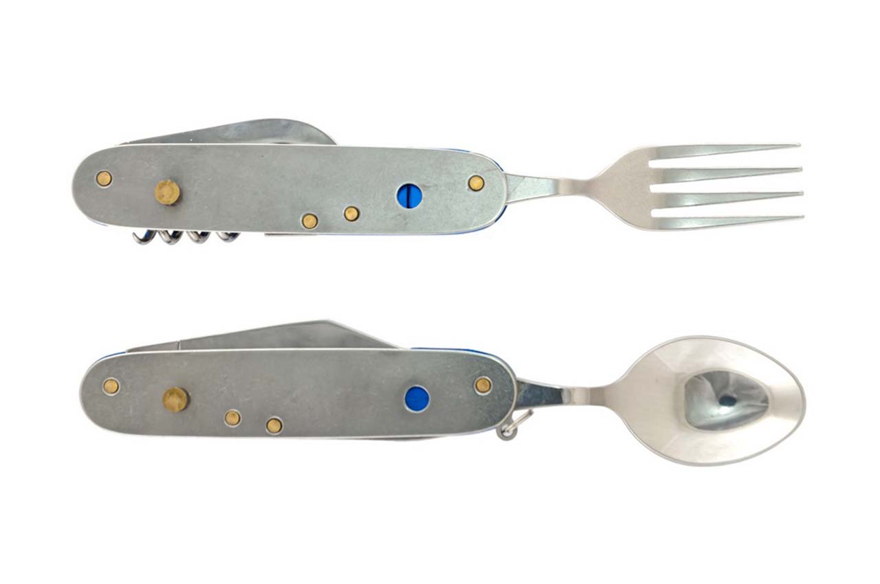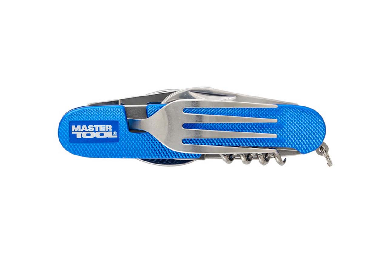 Мультитул Mastertool - 7-в-1 – це універсальний інструмент виготовлений з нержавіючої сталі. Лезо з нержавіючої сталі. Матеріал ручки: алюміній. Довжина ручки: 110 мм. Вага: 190 г. Мультитул має 7 функцій: 1. Виделка. 2. Ложка. 3. Штопор. 4. Ніж. 5. Перфоратор для шкіри. 6. Відкривачка для пляшок. 7. Відкривачка жерстяних банок