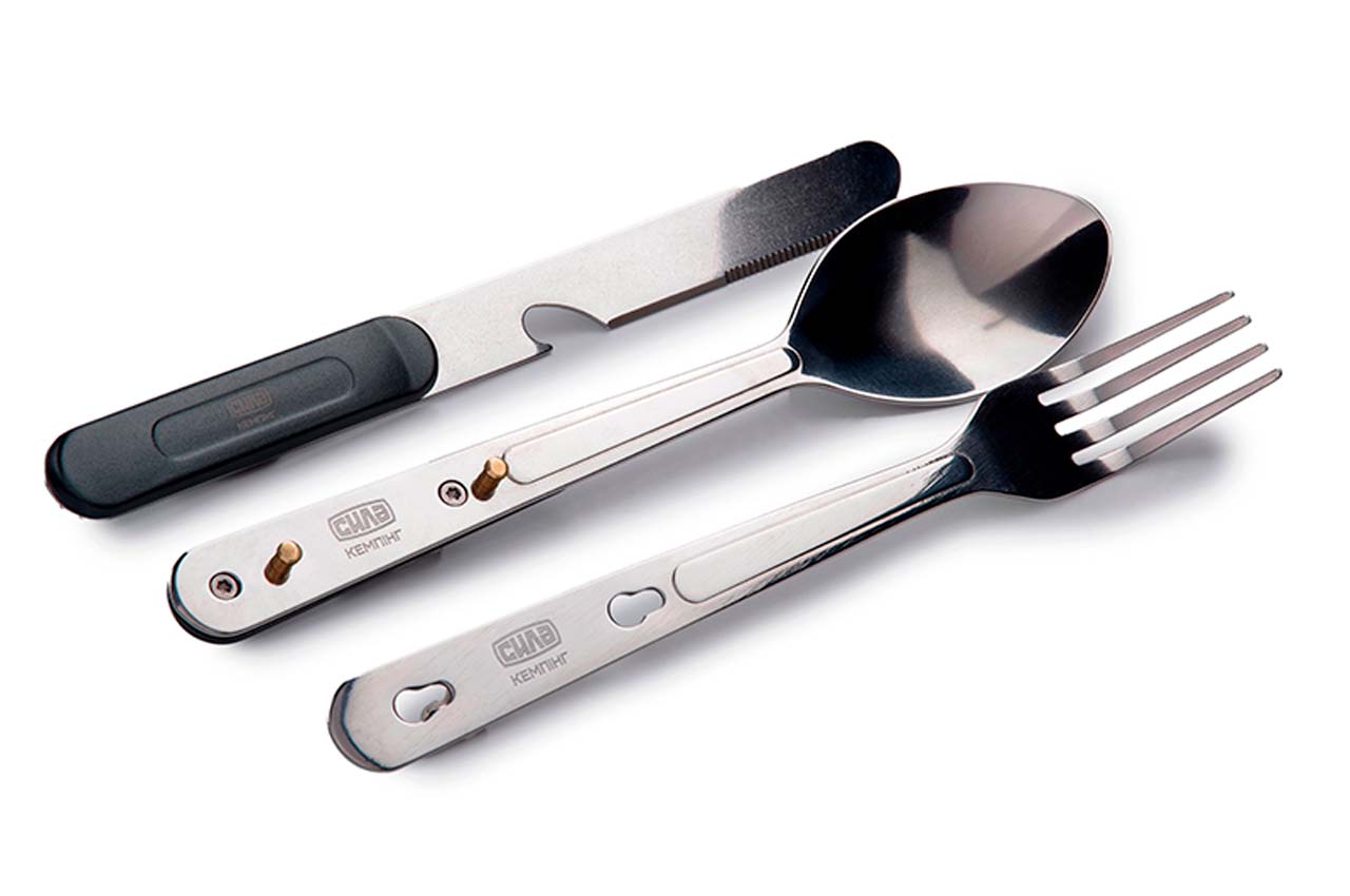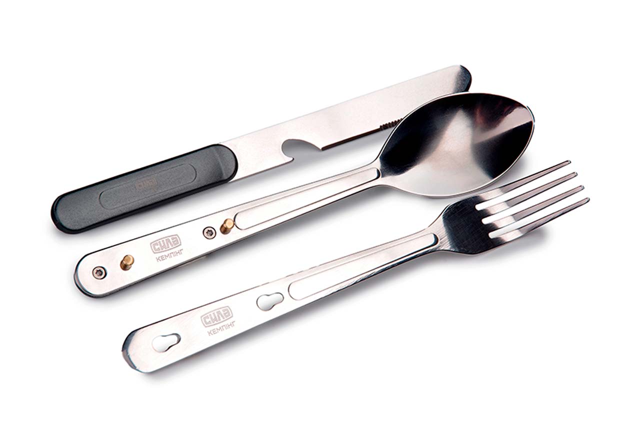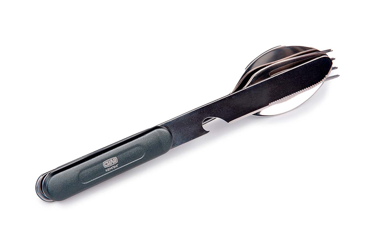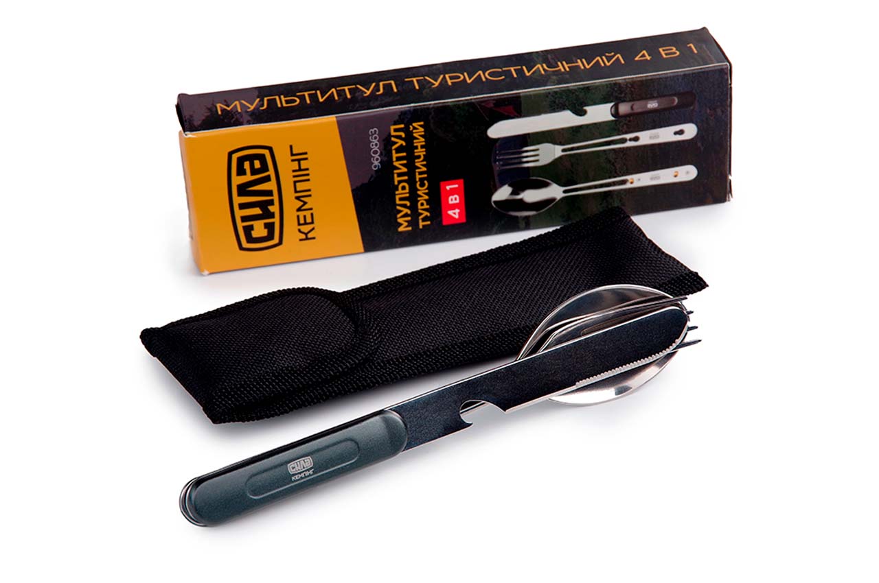 Мультитул Сила – 4-в-1. Комплектація: ніж; ложка; веделка; відкривання пляшок. Характеристики: Матеріал ручки: пластик ABS; Матеріал упаковки: чохол із нейлону + картон; Довжина леза: 110 мм; Довжина у складеному стані: 162 мм; Матеріал: нержавіюча сталь.