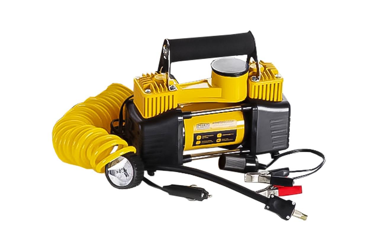 Автомобільний компресор Сила 12В х 10bar х 85л / хв однопоршневою застосовується для накачування шин різної техніки і гумових виробів. Компресор має компактний розмір, а також зручну складну ручку для його переміщення. Гумові упори виключають перекидання приладу під час функціонування. У верхній частині розташований манометр для контролю тиску повітря в шинах. До компресора додається зручний чохол на застібках. У такому чохлі прилад не тільки зручно зберігати, але ще і транспортувати його. Для нього завжди знайдеться місце в відсіку багажника будь-якого автомобіля. Довжина мережевого проводу: 3 м; Максимальна тривалість безперервної роботи: 30 хв; Напруга: 12 В; Тип підключення: Клеми акумулятора