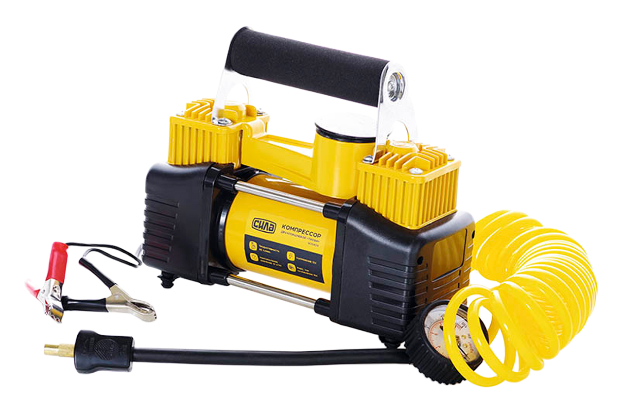 Потужний автомобільний компресор Сила 12В, 10 Бар і 85 літрів в хвилину призначений для підкачки автомобільних шин різного розміру. Висока потужність приладу 360 Вт обумовлена використанням відповідного електромотора, яким в дію наводяться два поршня насоса. Двопоршневий компресор відрізняється високою ефективністю, а також великий швидкість роботи. Продуктивність цієї моделі насоса становить 85 літрів в хвилину, що говорить про здатність накачати колесо до потрібного тиску всього за 3 хвилини. Максимальна величина тиску становить 10 атмосфер або 1 МПа. Харчування на електричний мотор приладу подається від акумулятора автомобіля, до якого компресор підключається через спеціальні затискачі типу В «крокоділВ». Максимальна сила струму становить 18 Ампер. У кабелі живлення має вмонтований запобіжник, захищає прилад від перегріву і короткого замикання. Поставляється пристрій з крученим шлангом високого тиску, довжина якого становить 3 метри. Манометр кріпиться до шлангу високого тиску, що дуже зручно контролювати тиск в накачувати об'єкті. Ця модель компресора підходить не тільки для малолітражних легкових автомобілів, але ще і для кросоверів, позашляховиків, джипів, мініавтобусів і інших видів техніки. Довжина мережевого проводу: 3 м; Максимальна тривалість безперервної роботи: 30 хв; Напруга: 12 В; Тип підключення: Клеми акумулятора Ця модель компресора підходить не тільки для малолітражних легкових автомобілів, але ще і для кросоверів, позашляховиків, джипів, мініавтобусів і інших видів техніки. Довжина мережевого проводу: 3 м; Максимальна тривалість безперервної роботи: 30 хв; Напруга: 12 В; Тип підключення: Клеми акумулятора Ця модель компресора підходить не тільки для малолітражних легкових автомобілів, але ще і для кросоверів, позашляховиків, джипів, мініавтобусів і інших видів техніки. Довжина мережевого проводу: 3 м; Максимальна тривалість безперервної роботи: 30 хв; Напруга: 12 В; Тип підключення: Клеми акумулятора