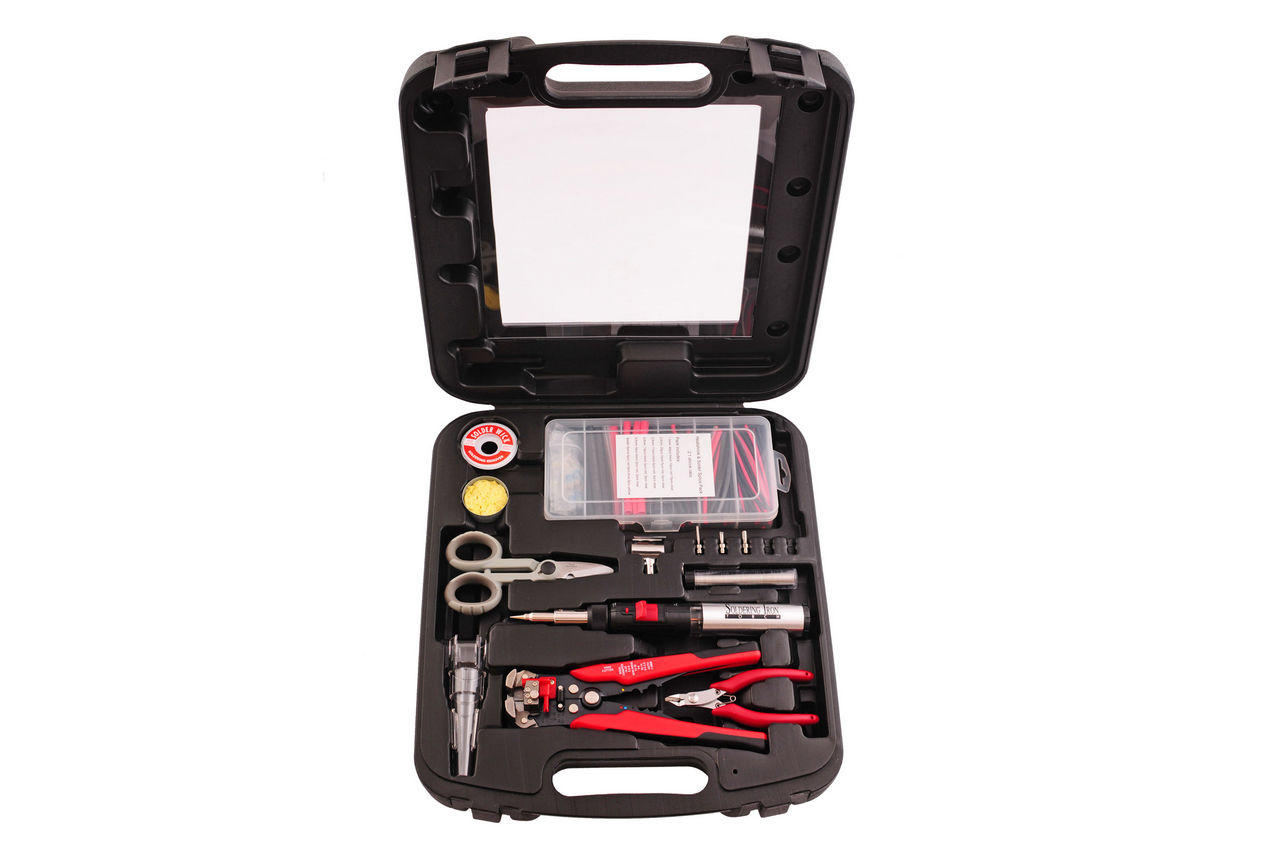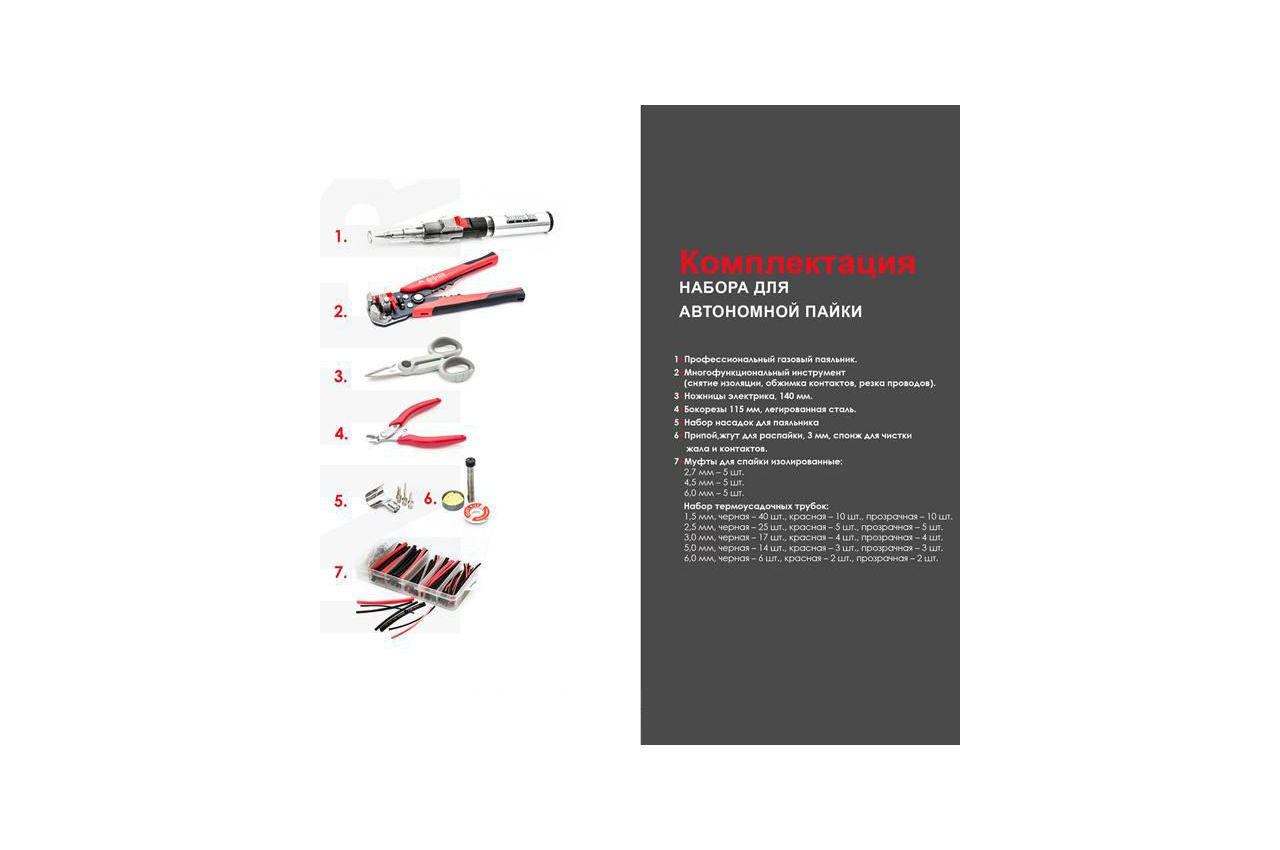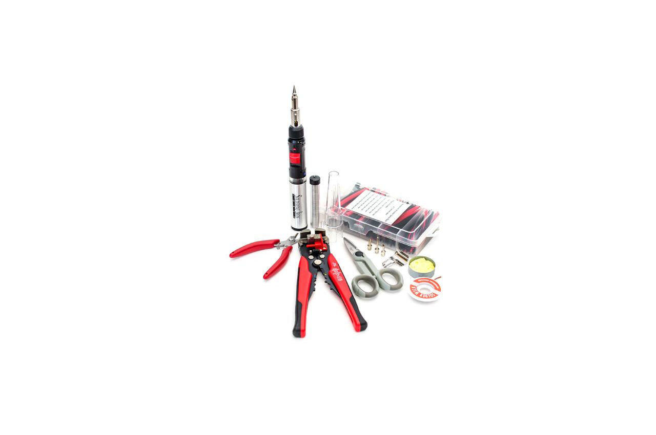 Зручний та якісний набір для швидкого ремонту. Включає в себе всі необхідні інструменти і матеріали для робіт з електропроводкою. Може застосовуватися для виконання таких завдань як пайка, гаряче різання, випалювання (пірографія), плавка, термоусадка або видалення фарби. Газовий паяльник виготовлений із застосуванням сучасних технологій і стандартів, що забезпечує максимальну ефективність роботи і збільшений термін служби приладу. Газовий паяльник вкрай легкий (100 грам) і зручно лежить в руці. Займання відбувається за допомогою пьезо-елемента, а час безперервного горіння становить від 30 до 60 хвилин. У наборі: газовий паяльник з набором змінних наконечників, бокорізи з нержавіючої сталі (115 мм), джгут для розпаювання (3 мм), ножиці електрика (140 мм), багатофункціональний інструмент для зняття ізоляції й обтиску контактів і різання проводів, муфти для спайки ізольовані, набір термозбіжних трубок. Час автономної роботи: 30-60 хв; Матеріал корпусу: алюміній / пластик; Займання: пьезо; Температура полум'я: 1200/680/550 ° С