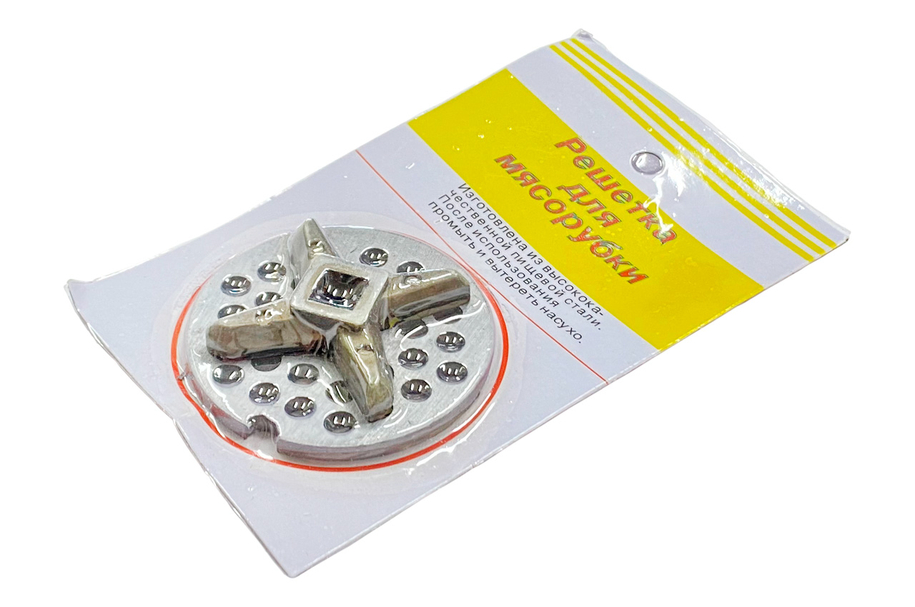 Універсальний комплект змінних елементів для м’ясорубки, що складається з гострого ножа та грат. Виготовлений із міцної нержавіючої сталі, забезпечує ефективне подрібнення м’яса та тривалий термін служби. Упаковка на блістері зручна для зберігання та транспортування.