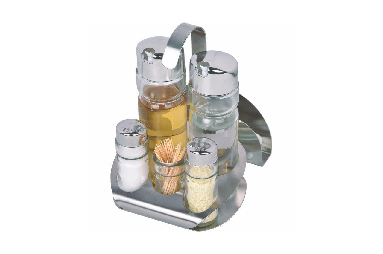 Набір для спецій Empire 7 пр, 9595 Набір для спецій 7 предметів: Ємність для масла; Ємність для оцту; Солонка; перечниця; Баночка для зубочисток; Салфетница; Підставка. Матеріал: скло / нержавіюча сталь.