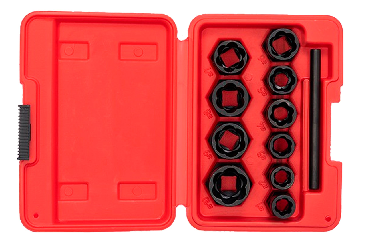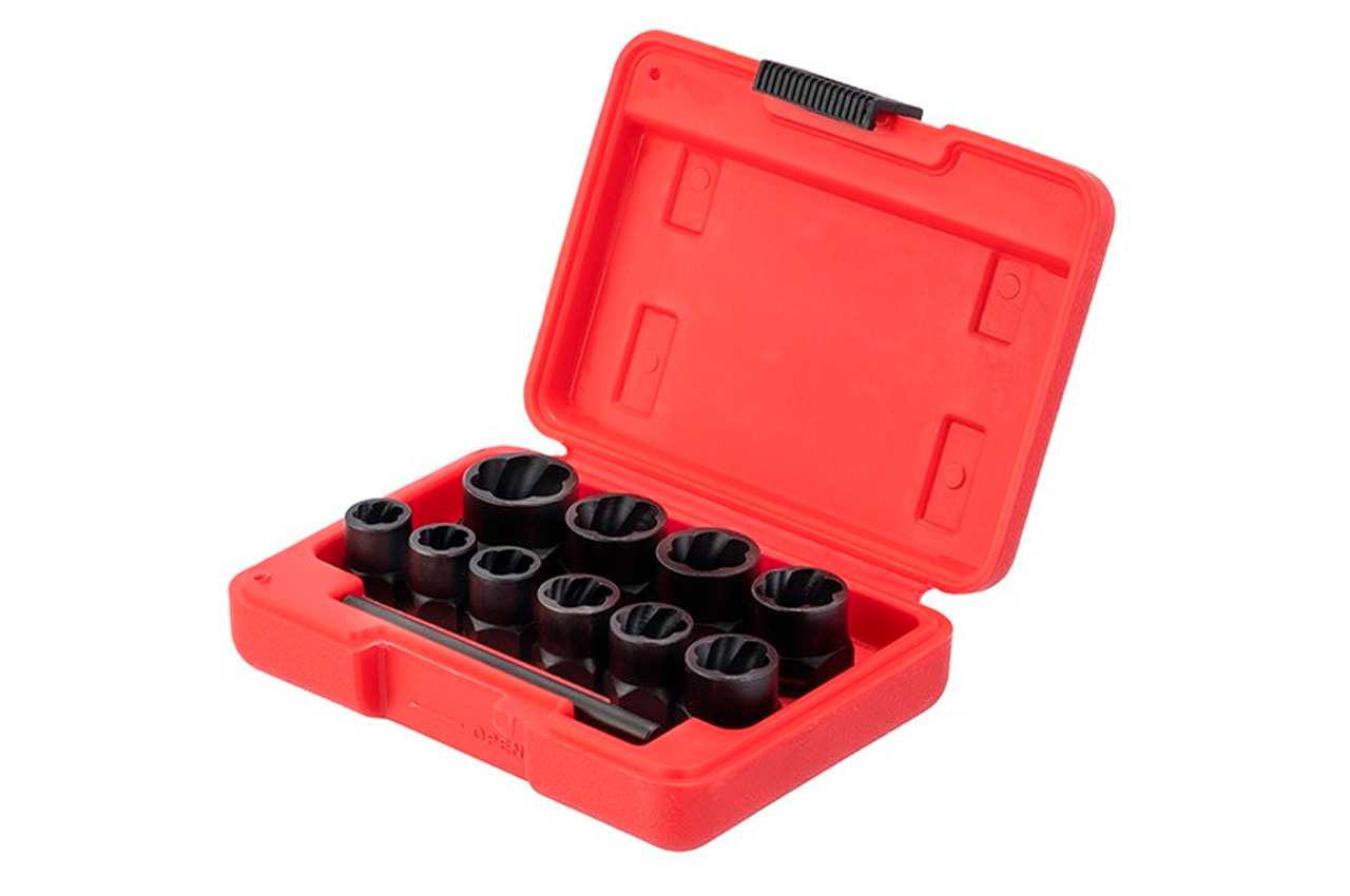 Набір подовжених екстракторів для пошкоджених болтів і гайок SD-8008 необхідний для демонтажу болтів і гайок, що пошкоджені чи мають стерті грані. Набір містить 10 екстракторів діаметром 9, 10, 11, 12, 13, 14, 15, 16, 17, 19 мм і виколотку для витягування застряглих кріплень. Всі елементі набору виготовлені з хром молібденової сталі, яка гарантує високу міцність і тривалий термін служби. Подовжена форма екстракторів дозволяє діставати глибоко посаджені болті і гайки.