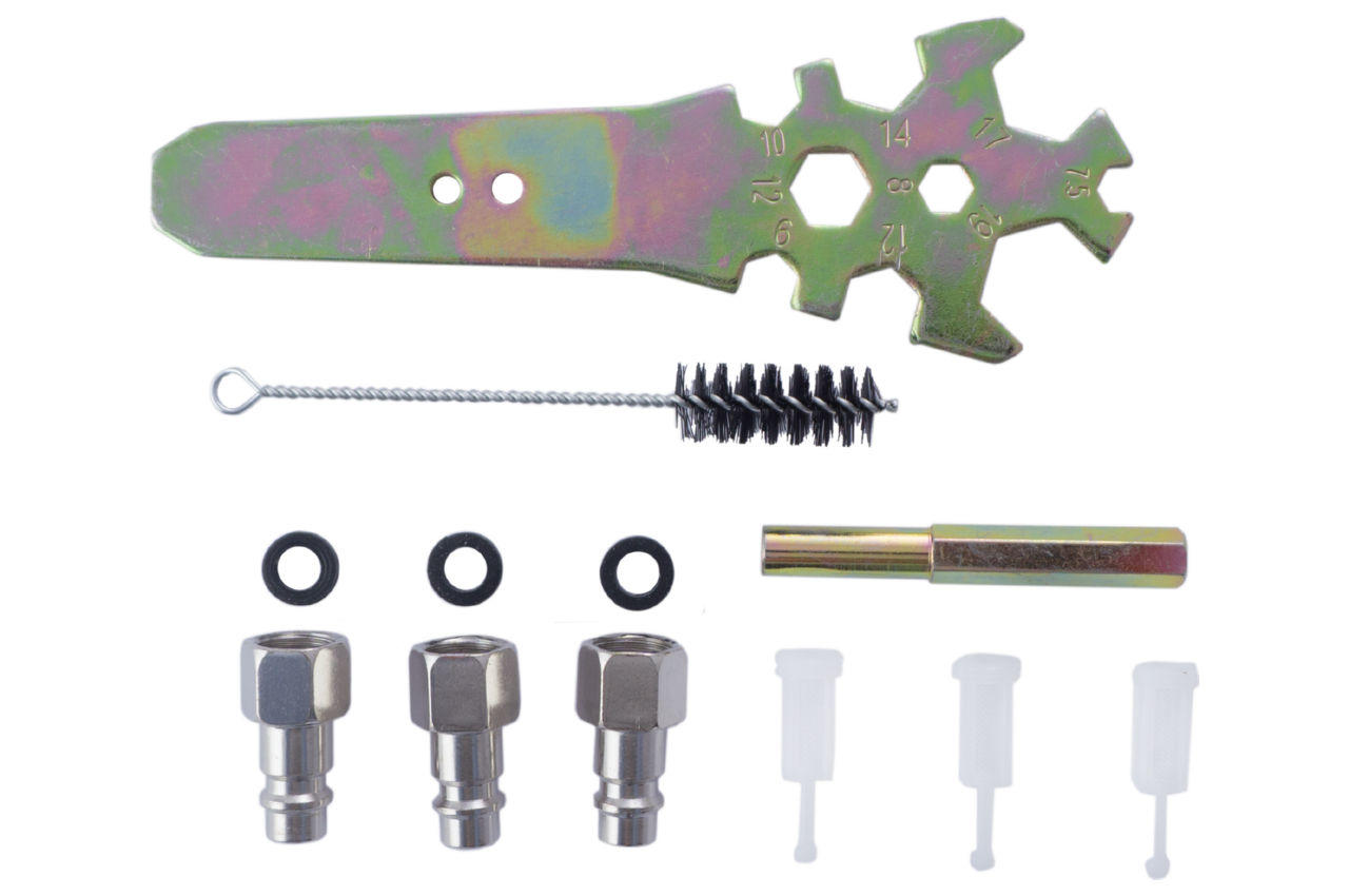 Набір фарбопультів PT-1505 містить три фарбопульти системи HVLP, такі, як: PT-0102 (PT-0117), PT-0119, PT-0101. Технологія HVLP забезпечує високу ефективність роботи, що характеризується використанням великих обсягів повітря при низькому тиску. Завдяки цьому коефіцієнт перенесення ЛКМ на поверхню, що обробляється, досягає 75%, що дозволяє економно використовувати витратні матеріали. Робочий тиск пістолетів вбирається у 3 атм, витрата повітря коливається не більше 230-300 л/мин. У комплекті два пістолети HVLP з діаметрами форсунок 1,3 та 1,7 мм з двома різними бачками (600 мл) - металевий та пластиковий, а також пістолет HVLP mini з форсункою 0,8 мм (125 мл). Набір закриває потребу в найпопулярніших пістолетах, розмірах форсунок, при цьому ви можете чимало заощадити. Краскопульт HVLP з форсункою 1, 3 мм чудово підходить для нанесення базового та фінішного покриття металу, а також нев'язких ЛКМ, у тому числі для використання акрилових фарб та лаків. Також використовується для фарбування металевих, дерев'яних, пластикових виробів, під час проведення авторемонтних, будівельних робіт, виготовлення столярних виробів тощо. Пістолет HVLP з форсункою 1,7 мм застосовується для нанесення ґрунтів, лаків, рідких шпаклівок, емалей та інших ЛКМ, що мають більш високу в'язкість. Пістолет HVLP mini з форсункою 0,8 мм підійде для фарбування невеликих поверхонь, аерографії, тонування та ін. У комплект також входить знімний регулятор тиску, який забезпечить зниження, контроль та фіксацію вхідного тиску. Його можна використовувати з будь-яким пістолетом із набору. Пістолети укомплектовані швидкороз'ємними з'єднаннями європейського типу. Також у комплекті набір для обслуговування, розбирання, збирання та чищення пістолетів. Переваги: Універсальний комплект з трьох найпопулярніших фарбопультів, з діаметрами форсунок, що найчастіше використовуються. Всі пістолети HVLP, економна та найпрогресивніша технологія розпилення. Робота з будь-яким покриттям. Регулятор тиску (редуктор) у комплекті. Пластикові бачки та металевий (для роботи з агресивними ЛКМ). Всі пістолети з постійного асортименту ви завжди можете придбати окремо форсунки різних діаметрів для заміни. Регулятор тиску (редуктор) у комплекті. Пластикові бачки та металевий (для роботи з агресивними ЛКМ). Всі пістолети з постійного асортименту ви завжди можете придбати окремо форсунки різних діаметрів для заміни. Регулятор тиску (редуктор) у комплекті. Пластикові бачки та металевий (для роботи з агресивними ЛКМ). Всі пістолети з постійного асортименту ви завжди можете придбати окремо форсунки різних діаметрів для заміни.