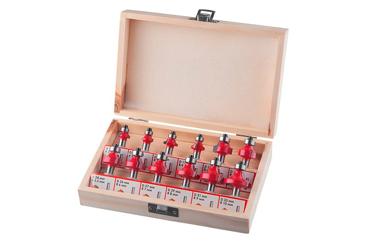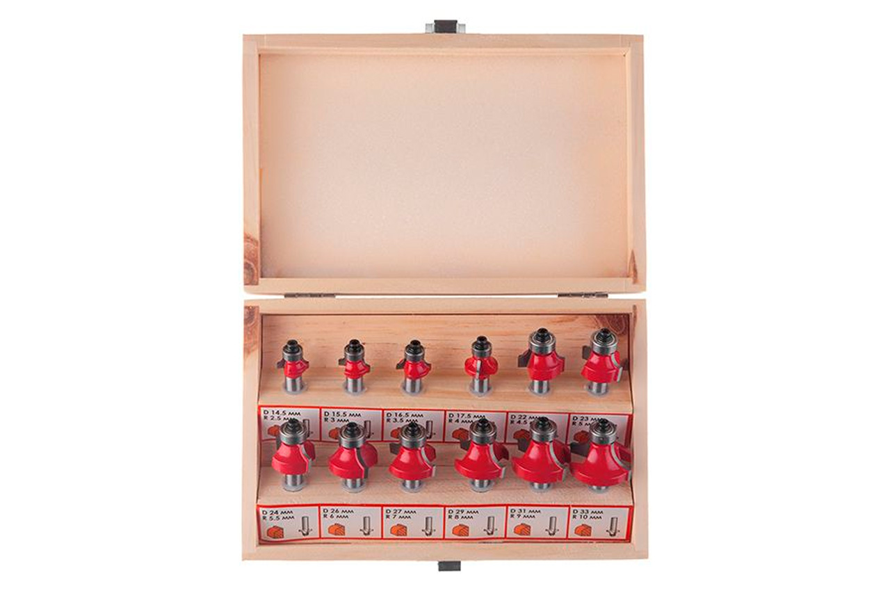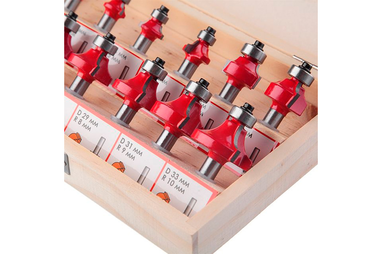 Калювальні фрези "Intertool", призначені для створення різних профілів по кромці дерев'яної заготовки. Наявність підшипника на кожній фрезі дозволяє обробляти профіль заготовки без застосування додаткового обладнання та упору фрезерного верстата на опорну напрямну. З їх допомогою виготовляють фігурні ніжки столів і стільців, шаф і декоративних виробів. Всі фрези (12 шт.) Укомплектовані в спеціальний дерев'яний кейс, який зручний як для зберігання, так і для транспортування. Діаметр фрез 15,5 - 33 мм. Діаметр хвостовика 8 мм. Твердість за шкалою Роквелла: 89 HRC; Кількість в наборі: 12 од .; Діаметр фрези: 15,5-33 мм; Діаметр хвостовика: 8 мм; Комплектація: фрези, дерев'яний кейс, шестигранний ключ для заміни підшипників