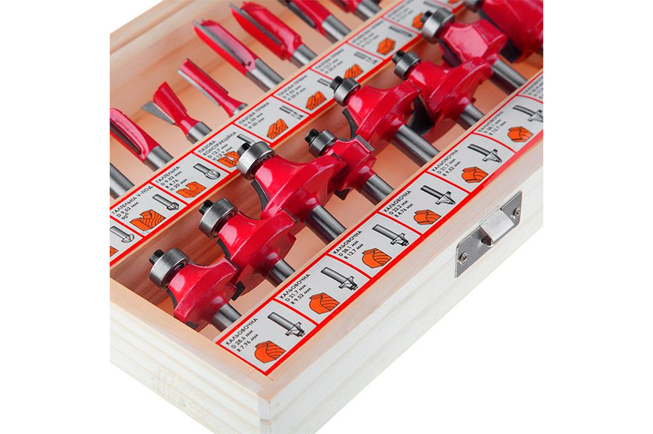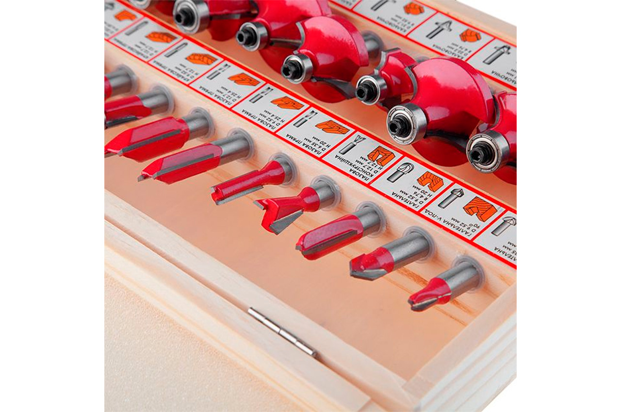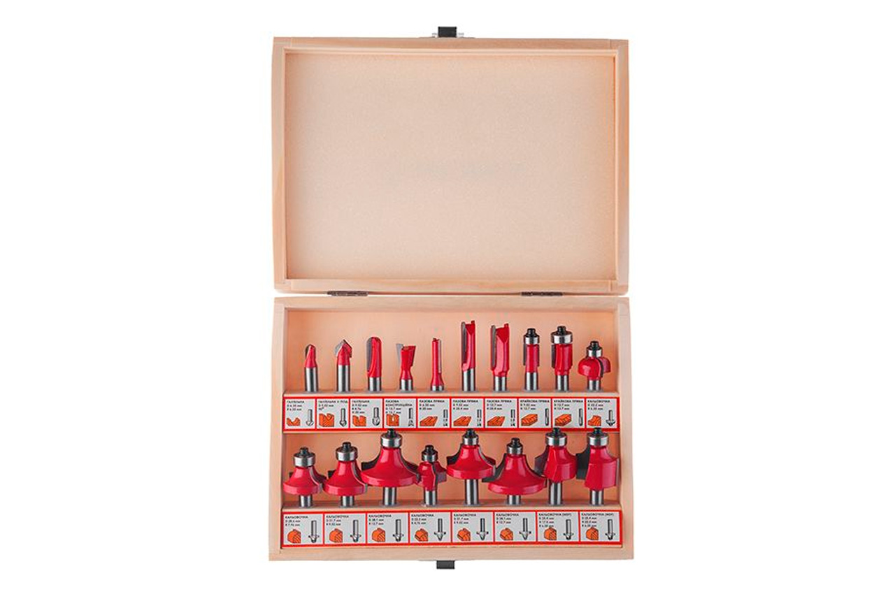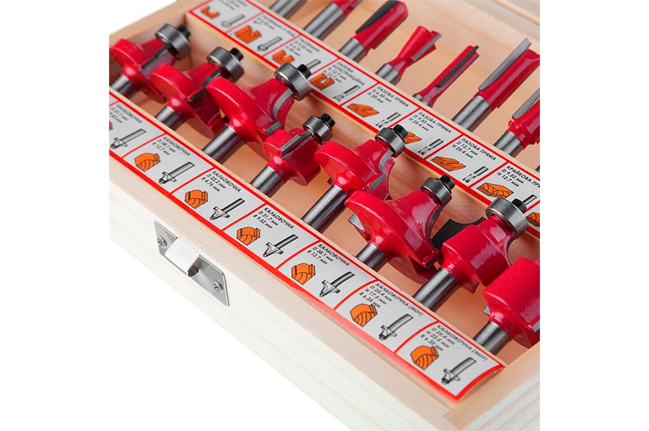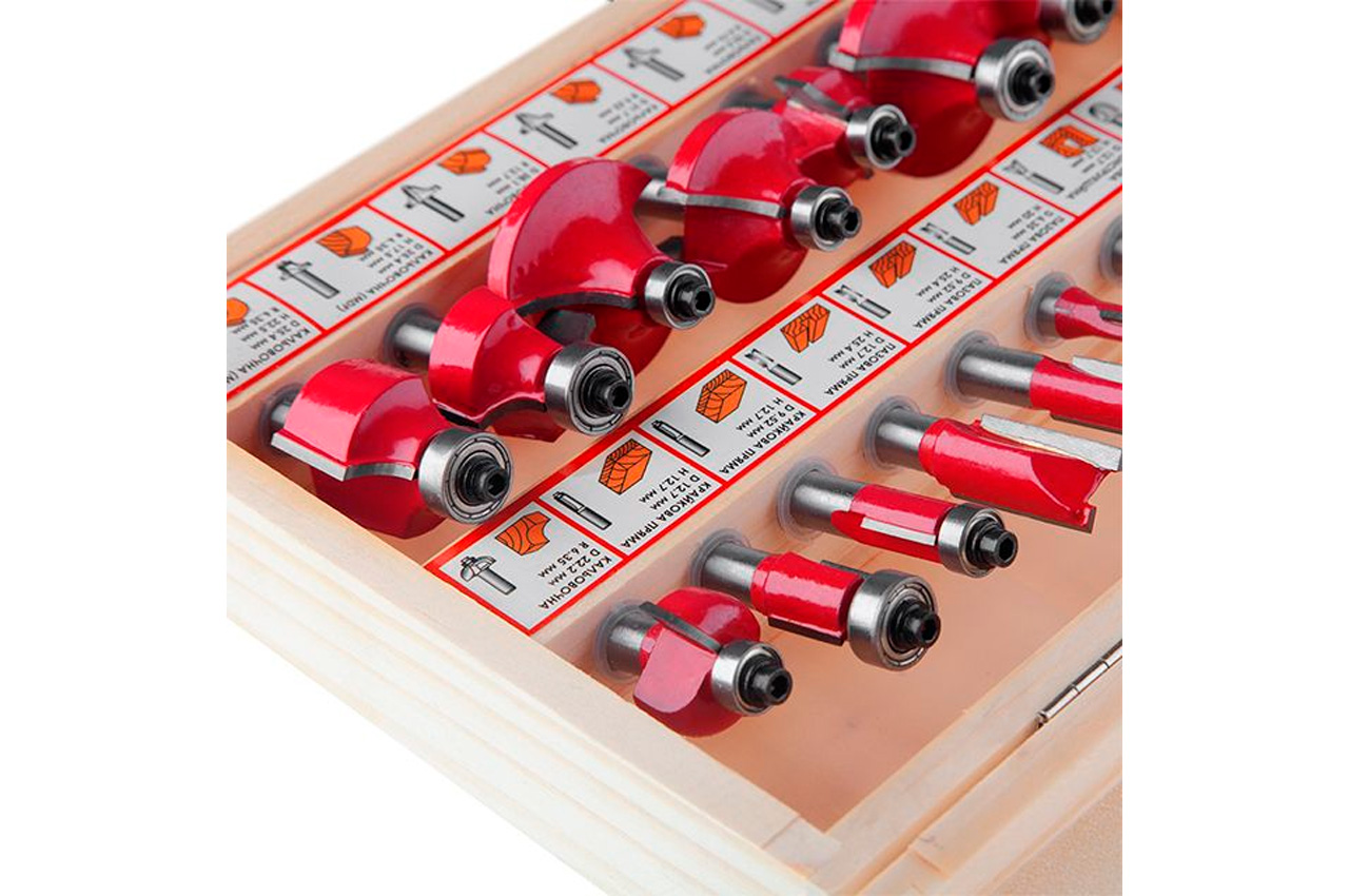 Фрези по дереву "Intertool" призначені для фрезерування, вибірки пазів різної форми, виконання паза і ін. Всі фрези (18 шт.) Укомплектовані в спеціальний дерев'яний кейс, який зручний як для зберігання, так і для транспортування. Діаметри фрез 6,35 - 38,1 мм. Діаметр хвостовика 8 мм. Твердість за шкалою Роквелла: 89 HRC; Кількість в наборі: 18 од .; Діаметр фрези: 6,35-38,1 мм; Діаметр хвостовика: 8 мм; Комплектація: фрези, дерев'яний кейс, шестигранний ключ для заміни підшипників