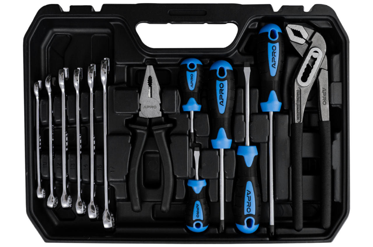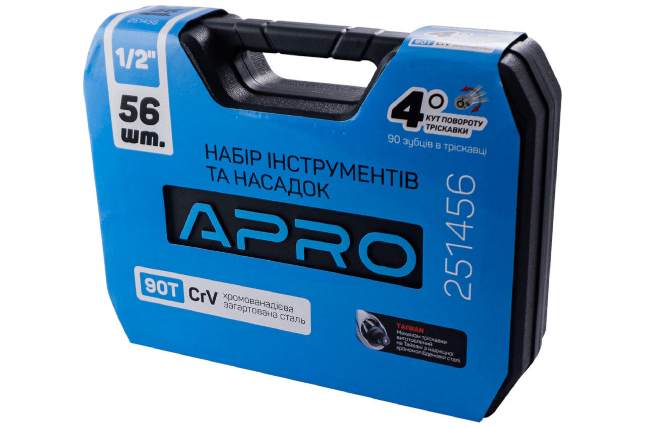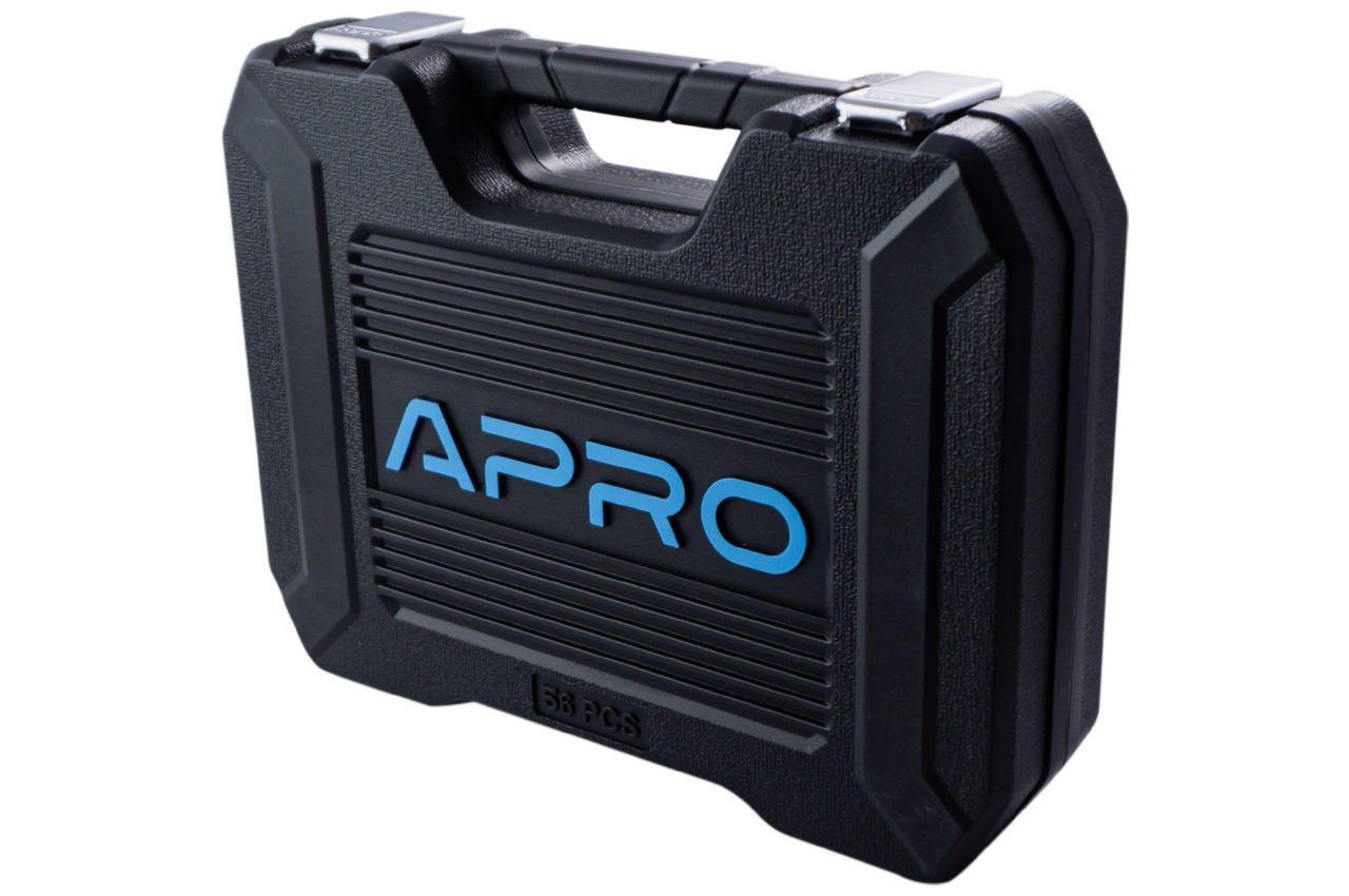 Набір інструментів APRO 251456 – універсальний набір для ремонтно-монтажних робіт, що складається з 56 предметів. Всі інструменти поміщені в зручний пластиковий кейс, що не займає багато місця і дозволяє зберігати інструментарій у первісному вигляді. Всі інструменти виготовлені з якісної хром-ванадієвої сталі, не бояться корозії та стійкі до різних механічних пошкоджень. Інструмент оснащений прогумованими ручками, що не ковзають навіть під час інтенсивної роботи. У комплекті йде пластиковий кейс, для зручного зберігання та транспортування інструменту.