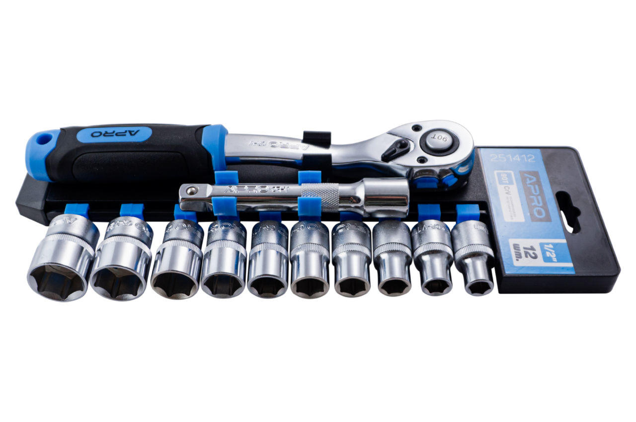 Набір інструментів APRO – универсальний набір для ремонтно-монтажних робіт, що складається з 12 предметів: Подовжувач 1/2": 125 мм Зуби в тріскавці 90 Насадки 1/2 10, 11, 12, 13, 14, 15, 17, 19, 22, 24 мм Гарантійний термін 12 місяців Матеріал хром-молібденова сталь