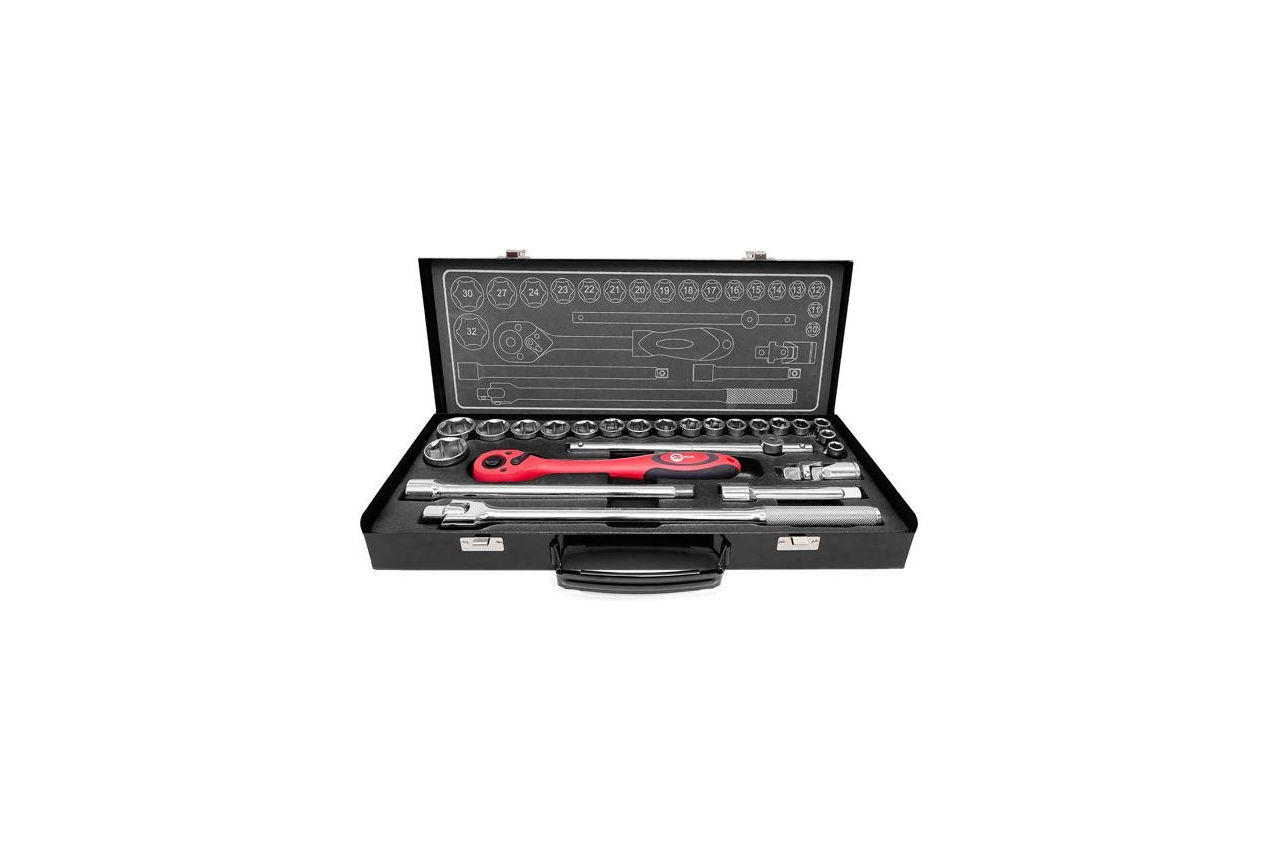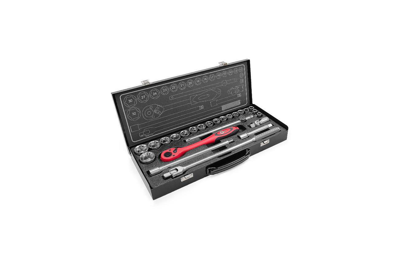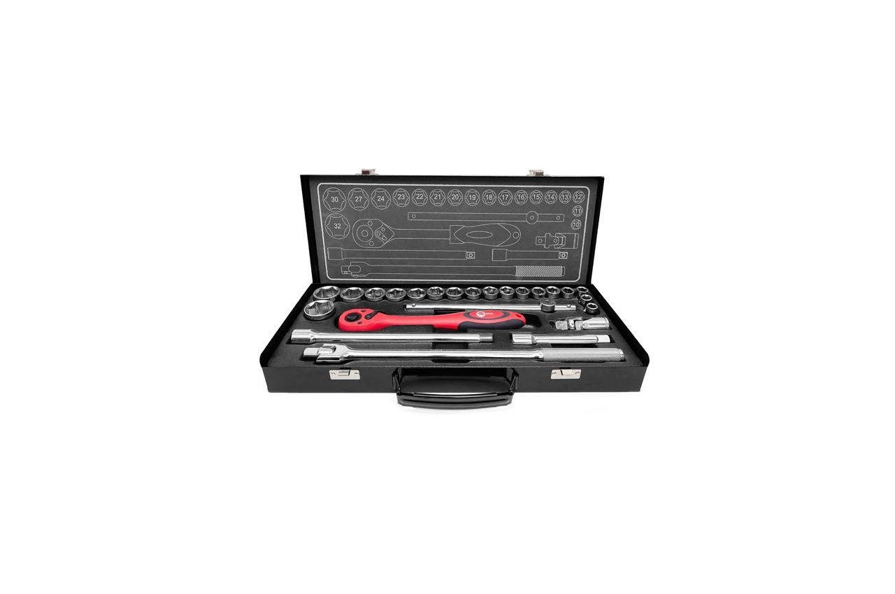 Професійний набір інструментів складається з 25 одиниць з квадратом 1/2 ". 18 торцевих головок діаметром від 10 до 32 мм. Виготовлені з міцної хром-ванадієвої сталі. Окремої уваги заслуговує рукоятка з храповим механізмом (тріскачка) на 72 зубця з можливістю скидання і фіксації торцевих головок, покрита захисним шаром з поліпропілену, повністю запобігає можливість появи корозії. Набір укомплектований в надійний металевий кейс. Габаритні розміри: 448х195х50 мм; Квадрат: 1/2 "; Кількість одиниць в наборі: 25 од .; Матеріал валізи: метал