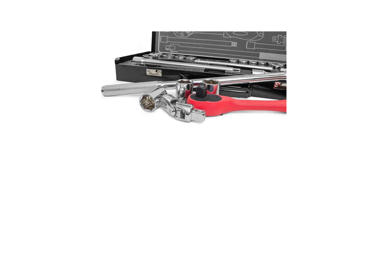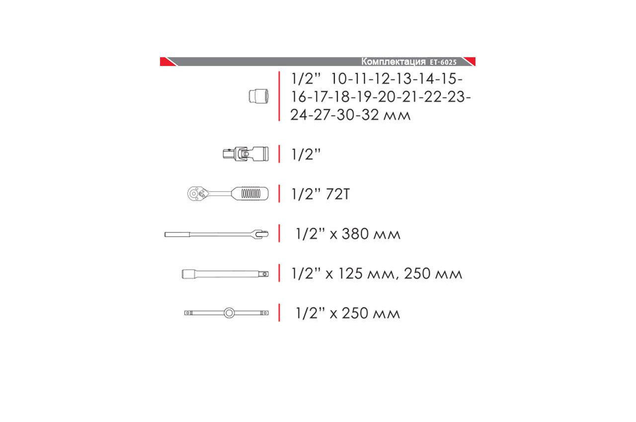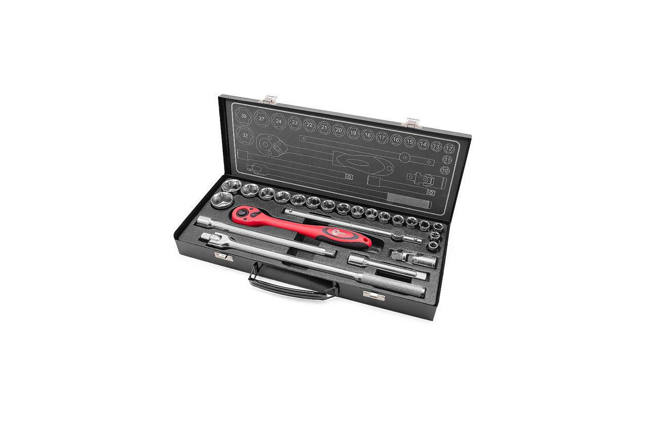 Професійний набір інструментів складається з 25 одиниць з квадратом 1/2 ". 18 торцевих головок діаметром від 10 до 32 мм. Виготовлені з міцної хром-ванадієвої сталі. Окремої уваги заслуговує рукоятка з храповим механізмом (тріскачка) на 72 зубця з можливістю скидання і фіксації торцевих головок, покрита захисним шаром з поліпропілену, повністю запобігає можливість появи корозії. Набір укомплектований в надійний металевий кейс. Габаритні розміри: 448х195х50 мм; Квадрат: 1/2 "; Кількість одиниць в наборі: 25 од .; Матеріал валізи: метал