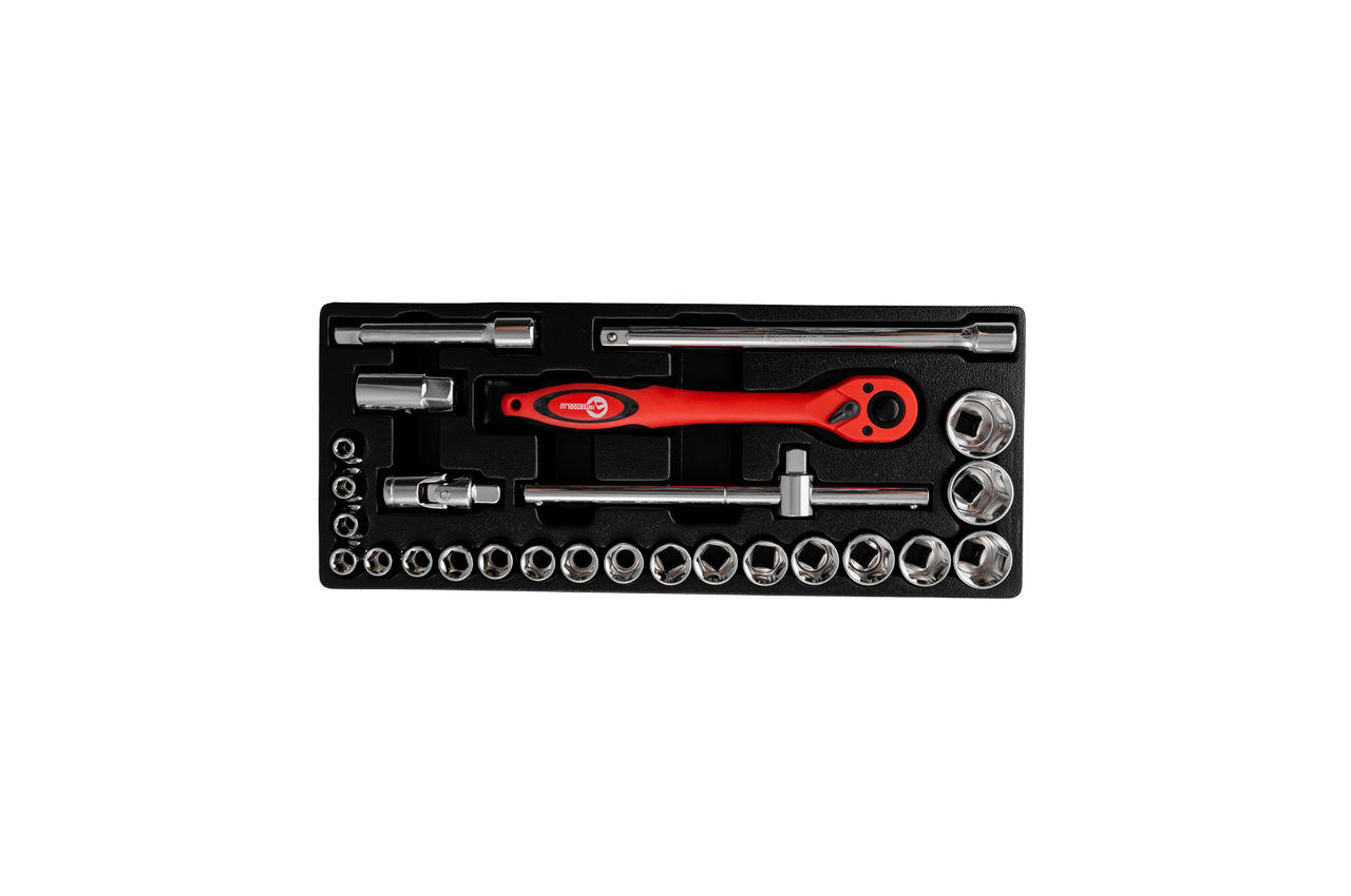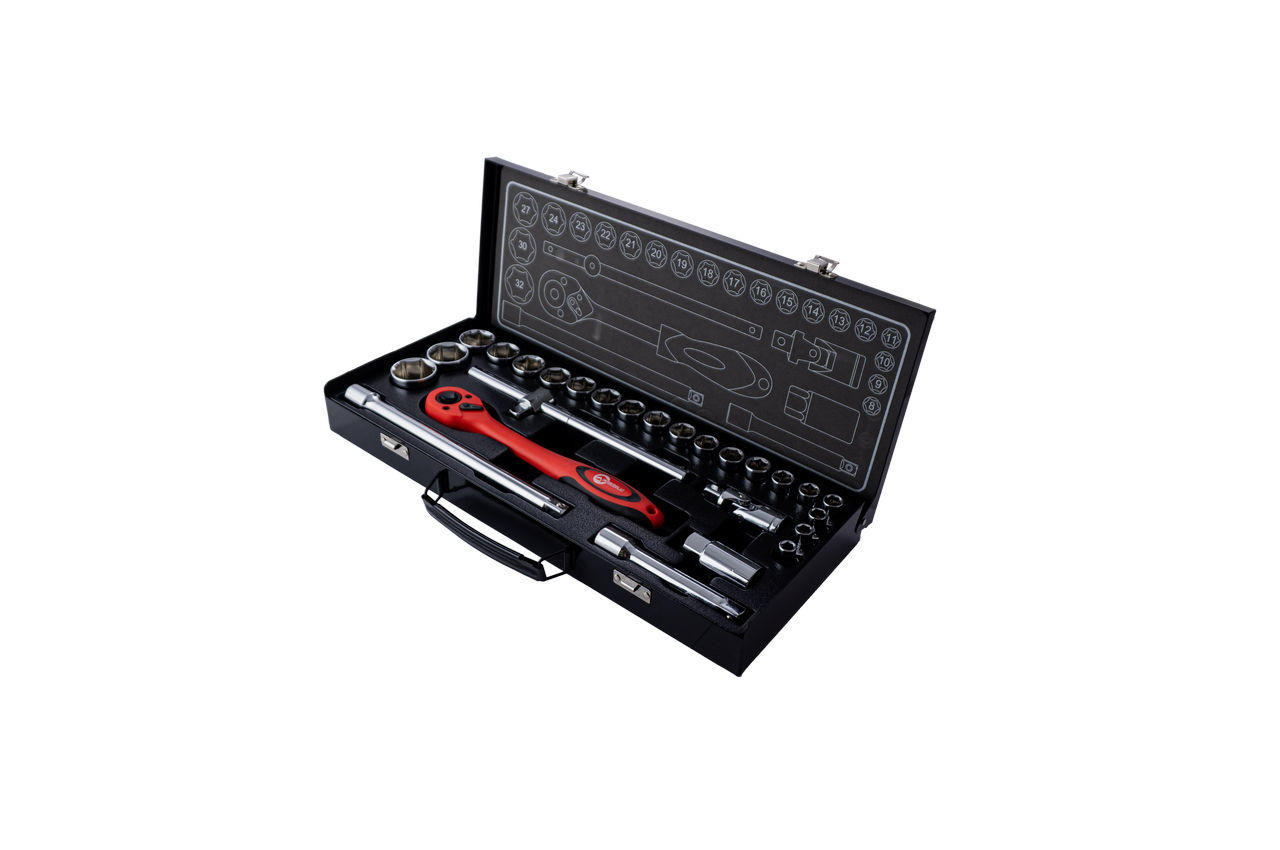 Набір інструментів включає в себе 26 одиниць з квадратом 1/2 ". Набір розміщується в зручному металевому кейсі. Використовуваний в наборі розмір квадрата - 1/2". Набір включає в себе 20 торцевих головок діаметром від 8 до 32 мм, комірець з плаваючою головкою, карданчик, свічковий головку, два перехідника і тріскачку. Габаритні розміри: 445х185х50 мм; Квадрат: 1/2 "; Кількість одиниць в наборі: 26 од .; Матеріал валізи: метал