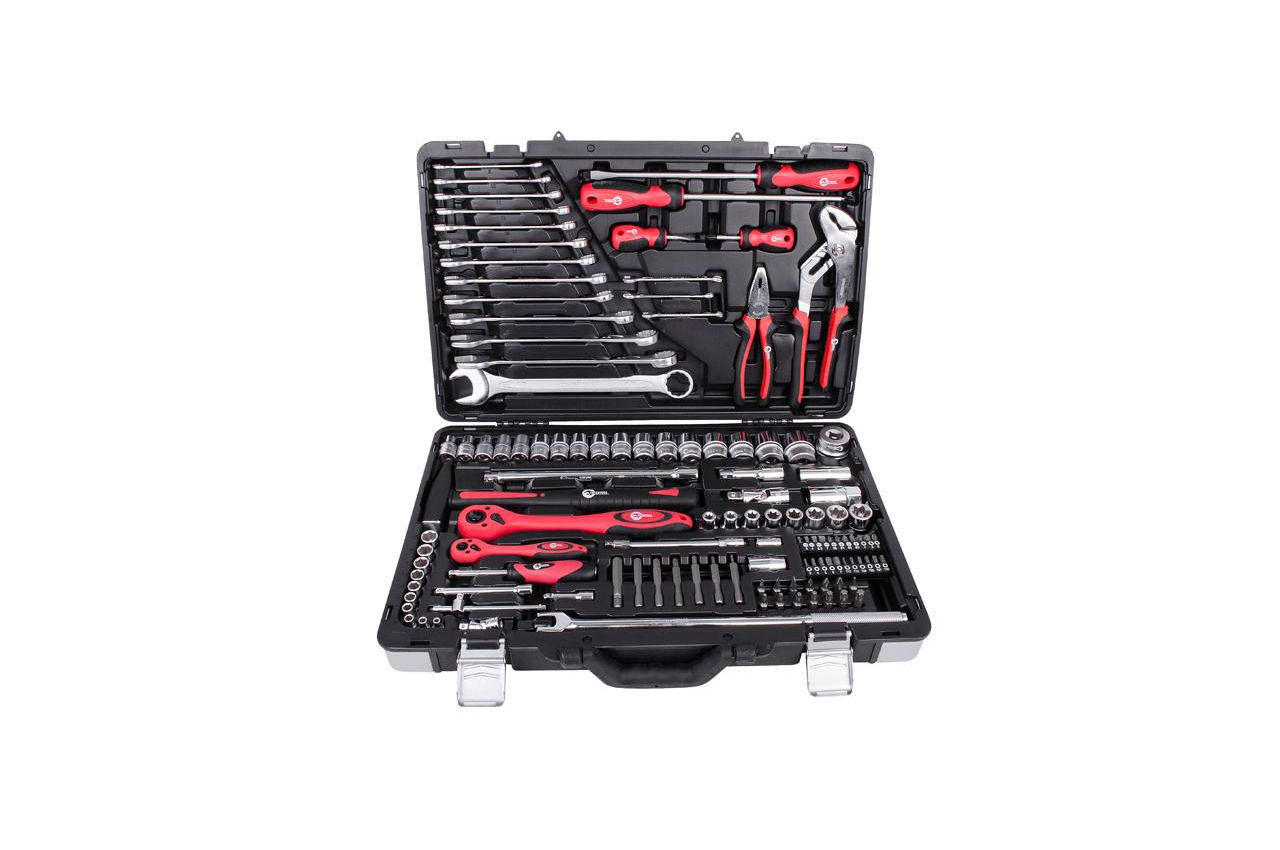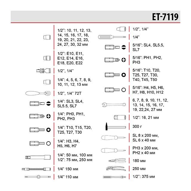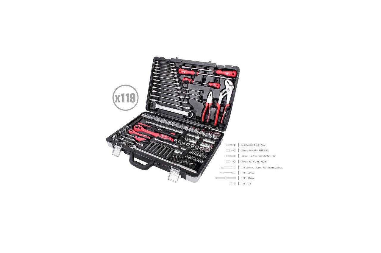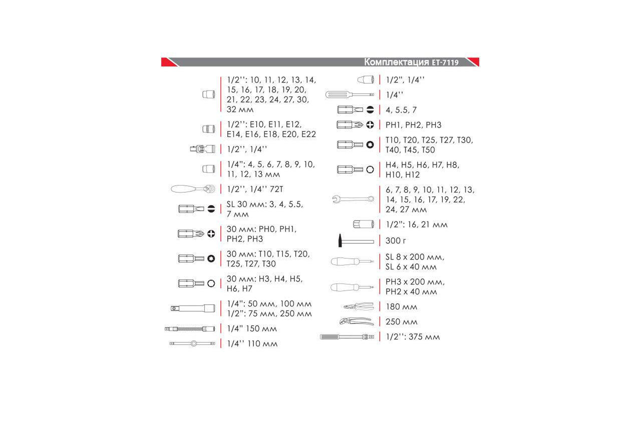 Набір включає в себе 16 комбінованих гайкових ключів діаметрами 6-27 мм, 10 торцевих головок з робочим квадратом 1/4 "(4-13 мм) і 18 торцевих головок з робочим квадратом 1/2" (10-32 мм). Крім того є 10 головок "зірок" (Е10, Е11, Е12, Е14, Е16, Е18, Е20, Е22). Також в наявності 2 рукоятки з храповим механізмом (тріскачки) на 72 зубця з робочими квадратами 1/2 "і 1/4" і можливістю скидання і фіксації торцевих головок. Ці рукоятки повністю покриті захисним шаром з поліпропілену, що виключає можливість появи корозії. Вони призначені для закручування і відкручування кріпильних елементів. Крім цього в набір увійшли два подовжувача з робочими квадратами 1/2 "і 1/4" - вони дозволяють працювати з кріпленням, розташованим в самих важкодоступних місцях; інструмент для зачистки проводів; молоток вагою 300 г; чотири викрутки з величезною кількістю насадок і біт, а також плоскогубці і кліщі. Габаритні розміри: 520х364х95 мм; Розмір рожково-накидних ключів: 6-27 мм; Квадрат: 1/2 "1/4"; Кількість одиниць в наборі: 119 од .; Матеріал валізи: пластик