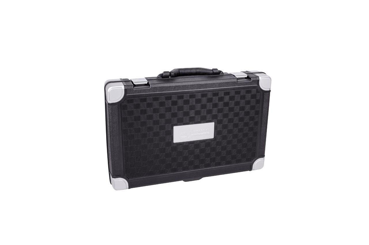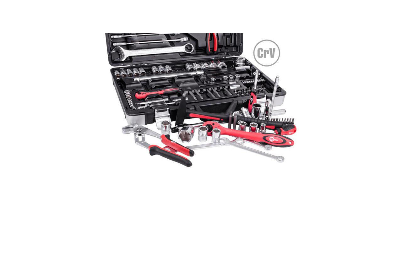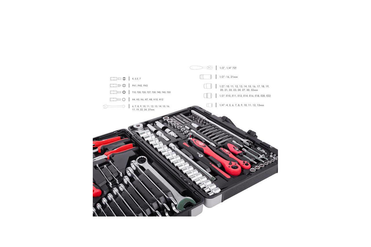 Набір включає в себе 16 комбінованих гайкових ключів діаметрами 6-27 мм, 10 торцевих головок з робочим квадратом 1/4 "(4-13 мм) і 18 торцевих головок з робочим квадратом 1/2" (10-32 мм). Крім того є 10 головок "зірок" (Е10, Е11, Е12, Е14, Е16, Е18, Е20, Е22). Також в наявності 2 рукоятки з храповим механізмом (тріскачки) на 72 зубця з робочими квадратами 1/2 "і 1/4" і можливістю скидання і фіксації торцевих головок. Ці рукоятки повністю покриті захисним шаром з поліпропілену, що виключає можливість появи корозії. Вони призначені для закручування і відкручування кріпильних елементів. Крім цього в набір увійшли два подовжувача з робочими квадратами 1/2 "і 1/4" - вони дозволяють працювати з кріпленням, розташованим в самих важкодоступних місцях; інструмент для зачистки проводів; молоток вагою 300 г; чотири викрутки з величезною кількістю насадок і біт, а також плоскогубці і кліщі. Габаритні розміри: 520х364х95 мм; Розмір рожково-накидних ключів: 6-27 мм; Квадрат: 1/2 "1/4"; Кількість одиниць в наборі: 119 од .; Матеріал валізи: пластик