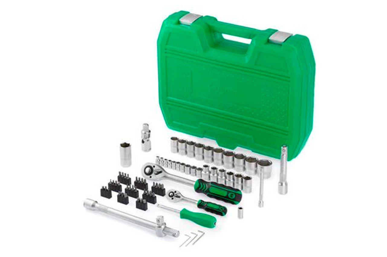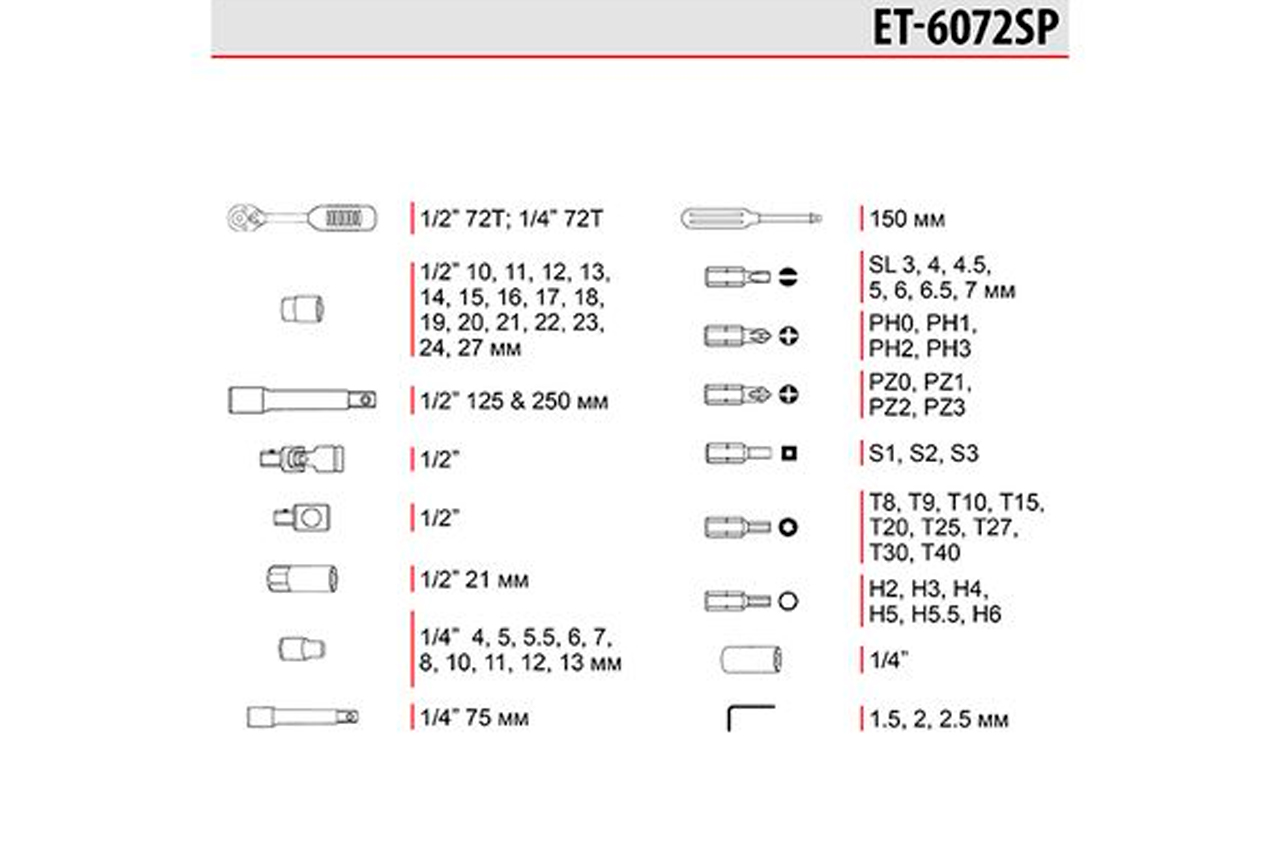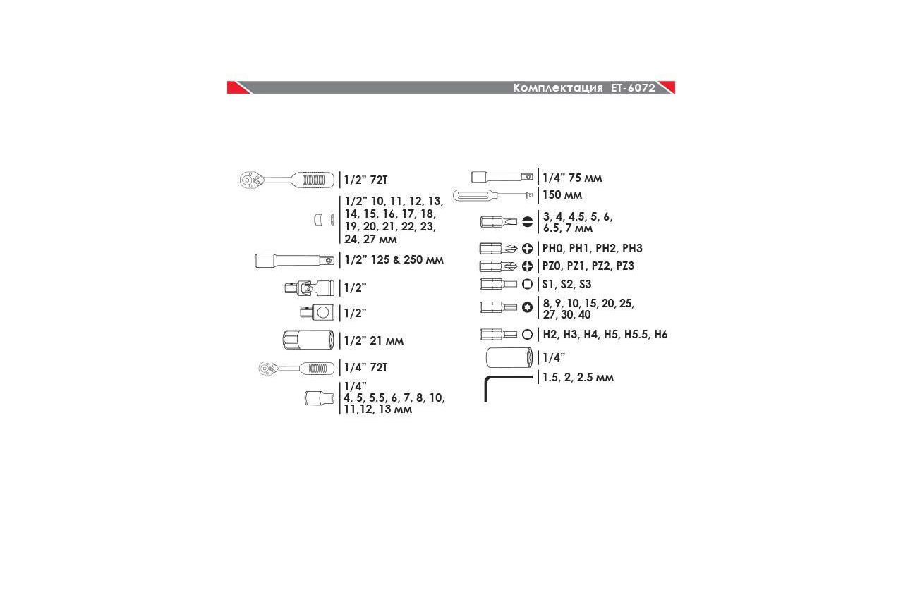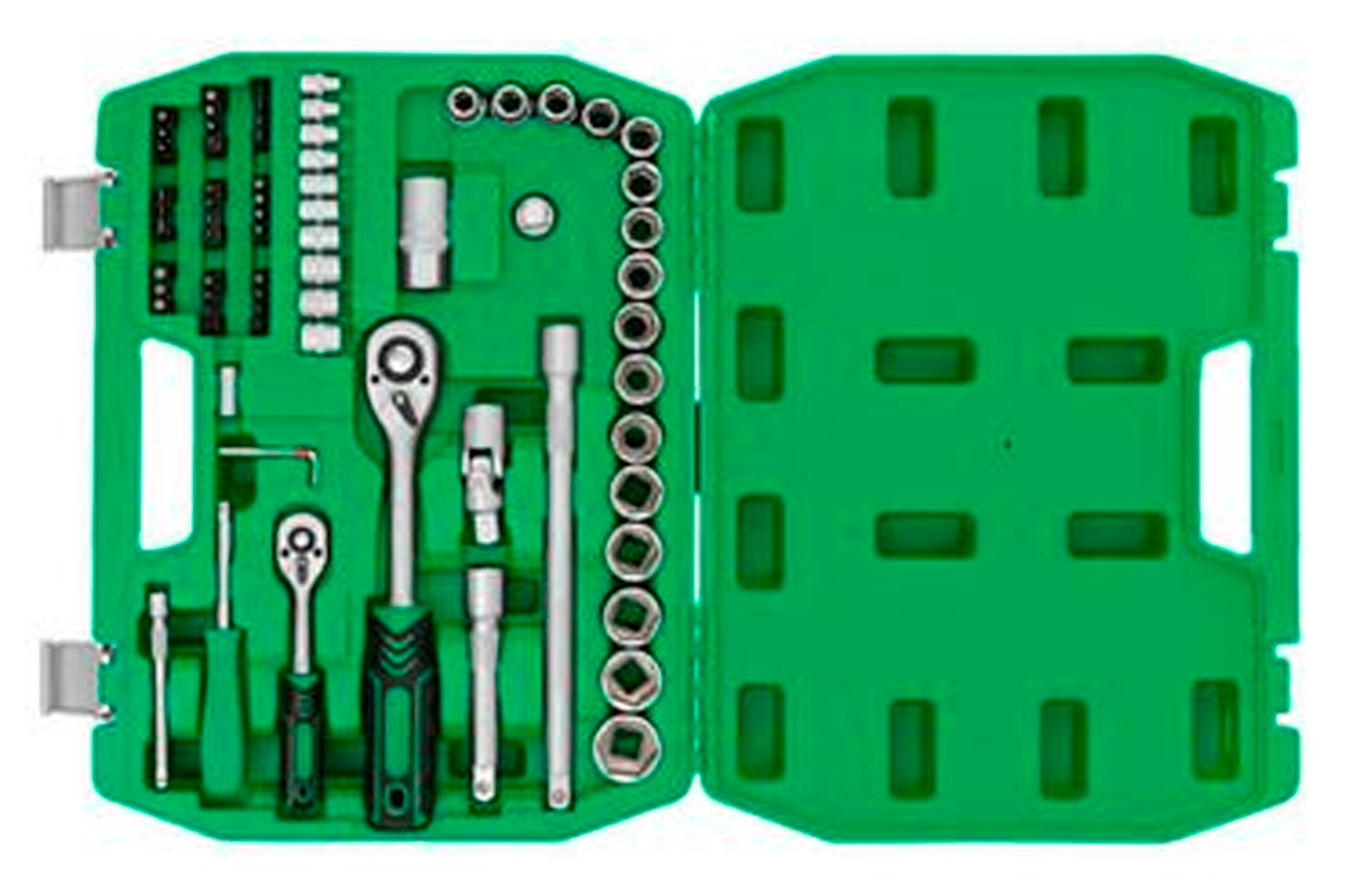 Набір складається з 72 одиниць з робочими квадратами 1/2 "і 1/4", практичний і надійний в експлуатації. Головки розмірами від 4-27 мм. Всі насадки виготовлені з хром-ванадієвої сталі. Набір укомплектований в зручний пластиковий кейс. Завдяки суворого дотримання технології виробництва, весь інструмент характерізуюется точністю і відсутністю дефектів. Невеликі габарити набору, дозволяють зберігати його як в гаражі, так і вдома. Кількість одиниць в наборі: 72 од .; Квадрат: 1/2 "1/4"; Габаритні розміри: 400х300х90 мм