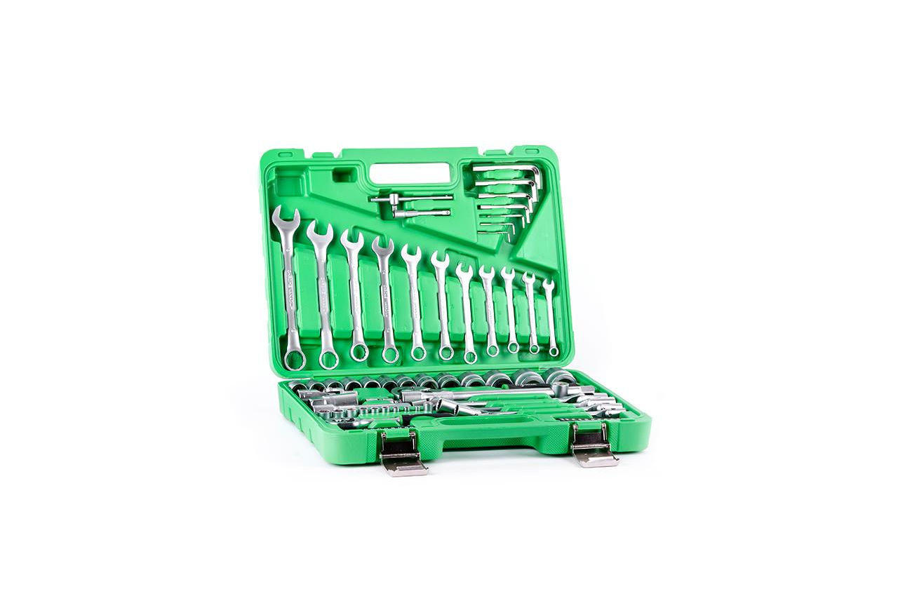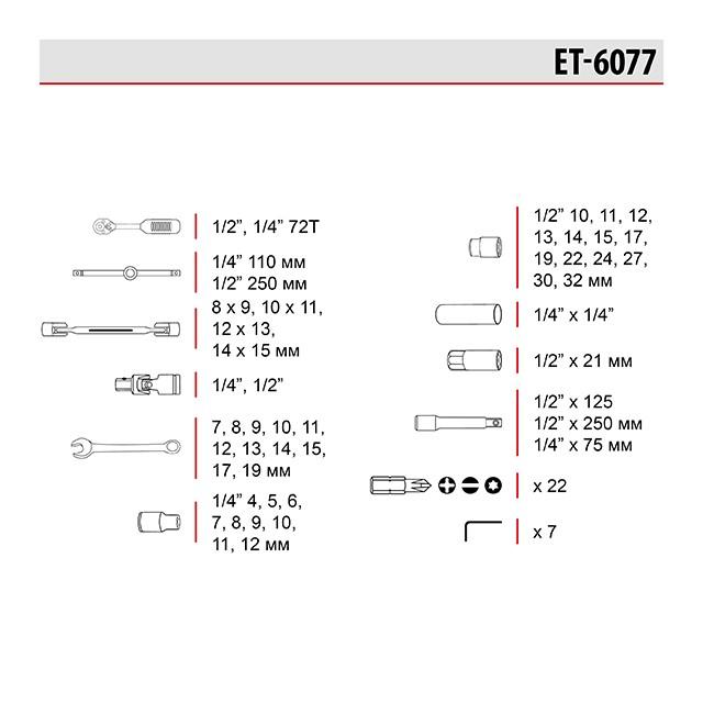 Набір складається з 77 одиниць з робочими квадратами 1/2 "і 1/4", практичний і надійний в експлуатації. Всі насадки виготовлені з високоміцного хром-ванадієвої сплаву, що забезпечує високі експлуатаційні характеристики, а також захист від корозії. Набір укомплектований в зручний пластиковий кейс.Налічіе великого набору рожково-накидних, шарнірних і Г-образних ключів, двох ключів-тріскачок, торцевих головок і різноманітних отверточних біт робить набір дуже універсальним і дозволяє здійснювати практично будь-які ремонтні роботи не тільки вдома, але і в гаражі або майстерні. Завдяки суворого дотримання технології виробництва, весь інструмент характеризуються точністю і відсутністю дефектів. Шарнірні ключі: 8-15 мм; Габаритні розміри: 395х295х80 мм; Розмір рожково-накидних ключів: 7-19 мм; Квадрат: 1/2 "1/4"; Кількість одиниць в наборі: 77 од .; Матеріал валізи: пластик