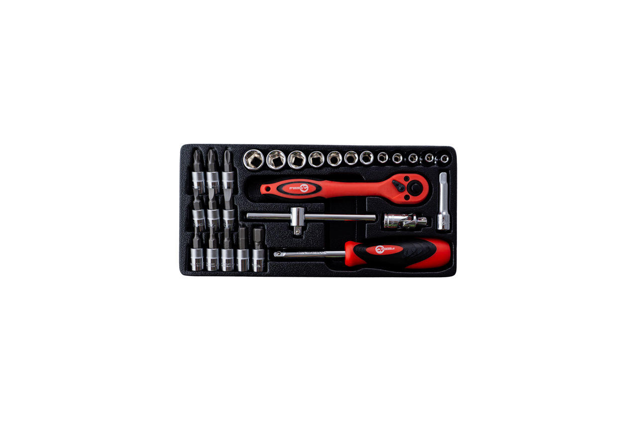 До складу даного набору входить 28 одиниць інструменту, укомплектовані в надійний кейс. Набір включає в себе 11 біт, 12 торцевих головок діаметром від 4 до 13 мм, 1 ключ з тріскачкою, карданчик, комірець з плаваючою головкою, подовжувач, отверточних держатель. Використовуваний в наборі розмір квадрата - 1/4 ". Габаритні розміри: 240х120х40 мм; Квадрат: 1/4"; Кількість одиниць в наборі: 28 од .; Матеріал валізи: метал