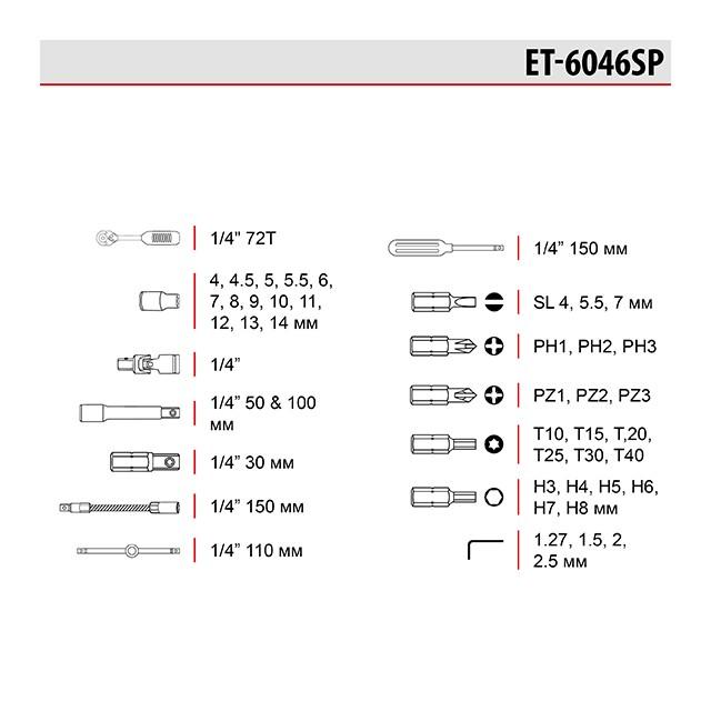 Набір складається з 46 одиниць з робочим квадратом 1/4 ". Всі насадки виготовлені з високоміцної хром-ванадієвої сталі. Набір укомплектований в зручний пластиковий кейс. Наявність великого набору торцевих головок і отверточних біт робить набір придатним для широкого спектру робіт. Габаритні розміри: 260х180х70 мм; Квадрат: 1/4 "; Кількість одиниць в наборі: 46 од .; Матеріал валізи: пластик