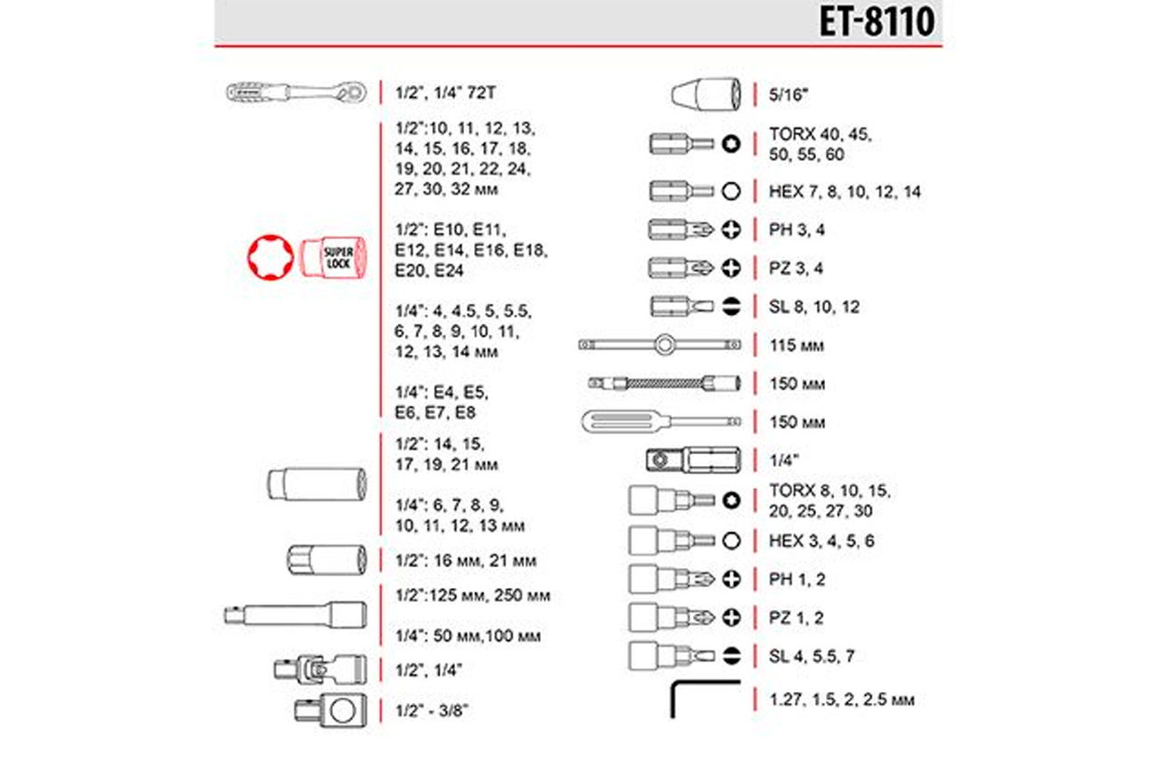 Набори інструментів STORM - це нове слово в підтримку якості і багатофункціональності! Завдяки своїй практичності ідеально підходять для автолюбителів і домашніх майстрів. Широкий вибір інструментів дозволяє впоратися майже з будь-яким видом кріплення, що дуже виручає при раптових поломок в дорозі і заміні деталей в гаражі. Головки: шестигранні, TORX, подовжені, свічкові, Трещоточна рукоятка: 1/2" та 1/4", 72 зуби, Біти: TORX, HEX, PH, PZ, SL, Габаритні розміри: 380 х 290 х 80 мм, Матеріал виготовлення : Cr-V сталь, Гарантія: 5 років, Розмір головок: 4-32 мм, Кількість одиниць у наборі: 110 од., Матеріал кейсу: ударостійкий пластик
