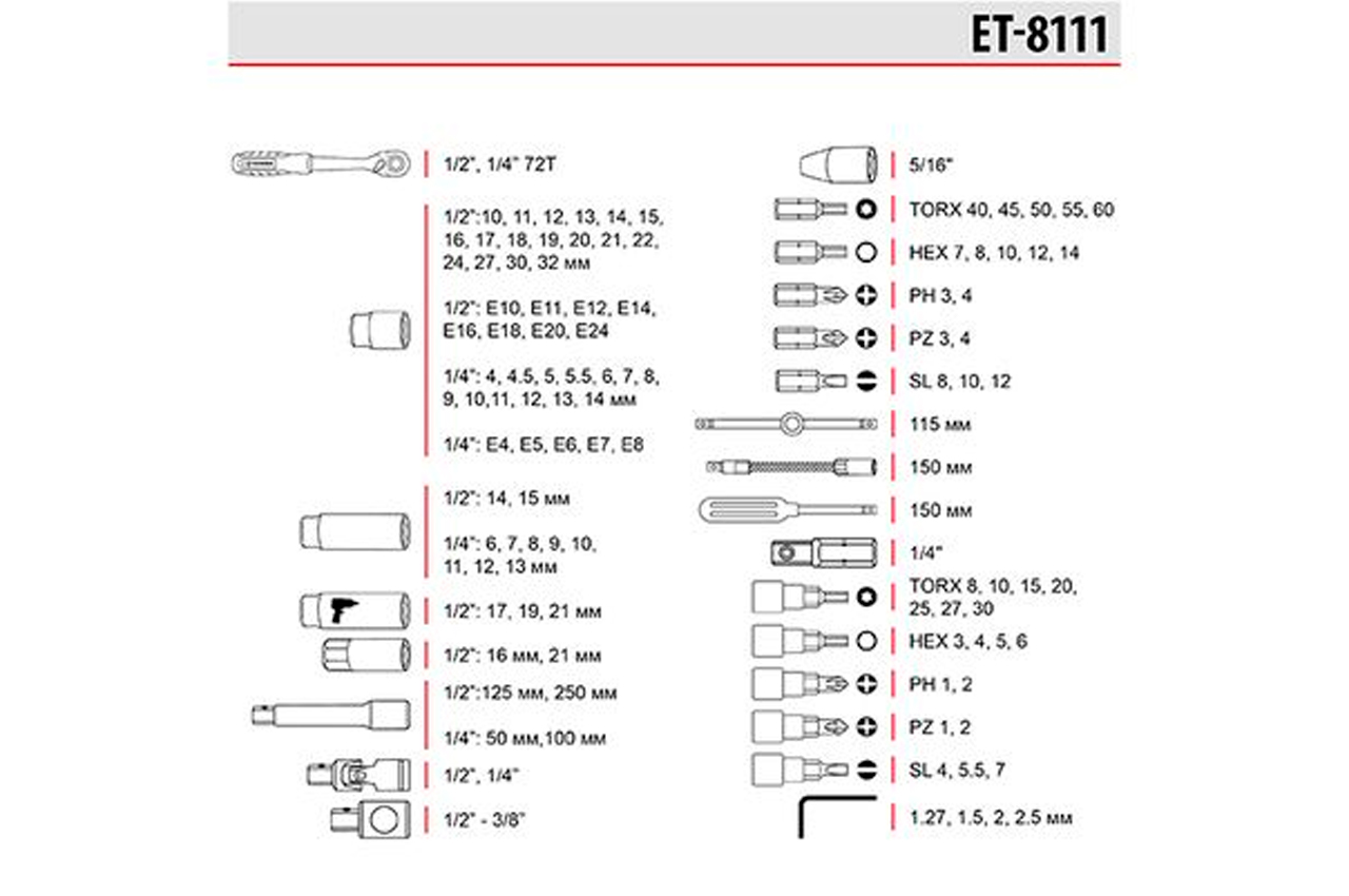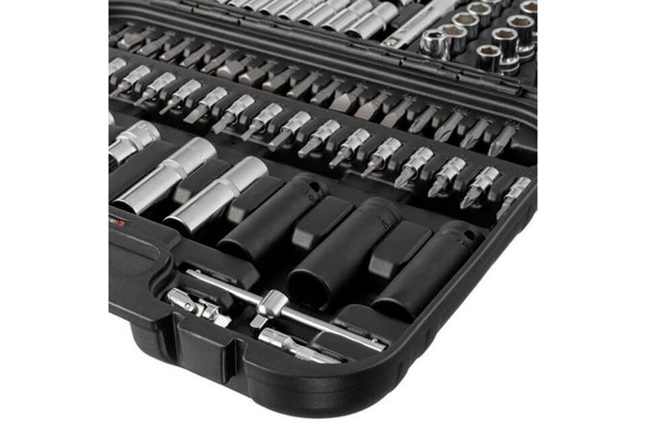 Набори інструментів STORM - це нове слово в підтримку якості і багатофункціональності! Завдяки своїй практичності ідеально підходять для автолюбителів і домашніх майстрів. Головки: шестигранні, TORX, подовжені, свічкові, Трещоточна рукоятка: 1/2" та 1/4", 72 зуби, Біти: TORX, HEX, PH, PZ, SL, Габаритні розміри: 380 х 290 х 85 мм, Матеріал виготовлення : Сr-V сталь, Гарантія: 5 років, Матеріал виготовлення ударних головок: Cr-Mo сталь, Розмір головок: 4-32 мм, Кількість одиниць у наборі: 111 од., Матеріал кейсу: Ударостійкий пластик