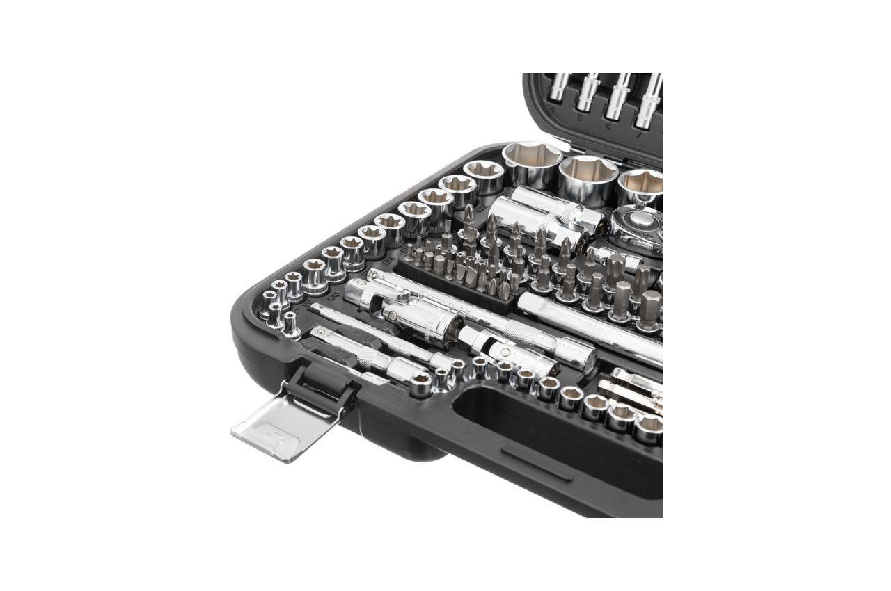 Набори інструментів STORM - це нове слово в підтримку якості і багатофункціональності! Завдяки своїй практичності ідеально підходять для автолюбителів і домашніх майстрів. Широкий вибір інструментів дозволяє впоратися майже з будь-яким видом кріплення, що дуже виручає при раптових поломок в дорозі і заміні деталей в гаражі. Надійні Трещеточний рукоятки Механізм тріскачки і все його комплектуючі виготовлені в Тайвані, в поєднанні з Cr-V сталлю - це міцний і надійний інструмент, з м'яким ходом храпового механізму. Зручне зберігання Торцеві головки, тріскачки, біти і інші комплектуючі розміщуються всередині надійного і компактного кейса з металевими замками, не випадають зі своїх осередків навіть після транспортування в багажнику автомобіля. Швидкий скидання головок і наявність реверсу спростять і в безліч разів прискорять роботу майстра. Вигнута форма рукояток для зручної роботи в важкодоступних місцях. Головки надійно фіксуються на посадочних квадратах тріскачок, не спадають і щільно прилягають до поверхні кріплення. На кожній головці нанесені насічки для запобігання ковзання в брудних руках або в рукавицях. Ручка тріскачок трехкомпонентная з TPR гуми, гарантує максимальне зчеплення з долонею, не ковзає і не випадає з ваших рук. Матеріал виготовлення Набір інструментів виготовлений з міцної і витривалою Cr-V стали. Головки і тріскачка з Cr-V 50BV30, відрізняються тривалим терміном служби, мають запас міцності і стійкі до навантажень. Двошарове нікелеве покриття забезпечує антикорозійні властивості інструментів. Кожна біта виконана зі сталі Cr-V 6150 з відмінними показниками твердості і пружності в своєму сегменті. Основою набору є три Трещеточний рукоятки, з посадочними квадратах: 1/2 ", 3/8", 1/4 ", а також шестигранні головки розміром від 4 до 32 мм. В комплекті додані головки E-типу з розмірним рядом від E4 до E24, для роботи з кріпленнями з типом профілю "зірочка", який часто зустрічаються в сучасних автомобілях. Подовжені головки від 4 до 19 мм допоможуть в роботі з високими шпильками гвинтів, а також у важкодоступних місцях. Свічкові головки на 16, 21 мм дозволяє викрутити свічку запалювання в будь-якому автомобілі і мототехніки. Подовжувачі та кардани допоможуть дістати кріплення в глибоких колодязях двигуна і в місцях з обмеженим простором. Різноманітність біт і головок з насадками знадобляться в побуті, для ремонту електротехніки, меблів та ін. Комбіновані ключі і ключі з тріскачкою в комплекті від 8 до 19 мм підійдуть для різнопланових робіт. Комплектація Трещеточний рукоятка 1/2 ", 72 зуба, реверсивних; Головка шестигранна торцева 1/2", 17 шт .: 10, 11, 12, 13, 14, 15, 16, 17, 18, 19, 20, 21, 22 , 24, 27, 30, 32 мм; Головка E-тип (Torx) 1/2 ", 3 шт .: E20, E22, E24. Головка подовжена шестигранна 1/2", 6 шт .: 10, 12, 13, 14, 17, 19 мм; Подовжувач 1/2 ", 2 шт .: 125 і 250 мм; Кардан 1/2"; Перехідник 3/8 "- 1/2". Трещеточний рукоятка 3/8 ", 72 зуба, реверсивних; Головка шестигранна торцева 3/8", 11 шт .: 9, 10, 11, 12, 13, 14, 15, 16, 17, 18, 19 мм; Головка E-тип (Torx) 3/8 ", 6 шт .: E10, E11, E12, E14, E16, E18; Головка шестигранна подовжена 3/8", 6 шт .: 10, 11, 12, 13, 14, 15 мм; Головка свічкова, 3/8 ", 2 шт .: 16, 21 мм; Подовжувач 3/8 ", 2 шт .: 75, 150 мм; Кардан 3/8"; Головки з насадками, 20 шт .: Головка з насадкою SL, 3 шт .: 4, 5.5, 6.5 мм; Головка з насадкою PH, 3 шт .: PH1, PH2, PH3; Головка з насадкою PZ, 3 шт .: PZ1, PZ2, PZ3. Головка з насадкою TORX, 5 шт .: T30, T 40, T 45, T50, T55; Головка з насадкою HEX, 6 шт .: 3, 4, 5, 6, 8, 10 мм. Трещеточний рукоятка 1/